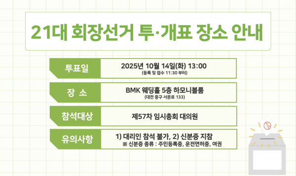 1379 제21대 회장선거 투·개표 장소안내 첨부파일이 있습니다. 신규게시물아이콘 경영지원 2025-09-30 3757