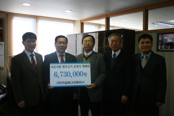 (사)대한양돈협회(회장 김동환)와 축산신문사(회장 윤봉중)가 공동으로 전개하고 있는 이웃사랑 돼지고기 보내기 성금 모금에 지난 1월 6일 퓨리나 사료(대표 이보균)가 6백73만원의 성금을 기탁했다.