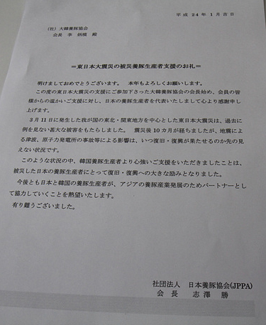 일본 양돈인들이 보낸 감사의 편지 ‘화제’ 양돈협, 지난해 12월 일본양돈협회에 성금 3천만원 기탁 동일본 지진 복구 위한 한국 양돈인들의 성금에 감사편지로 화답