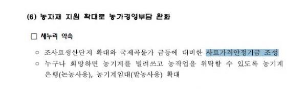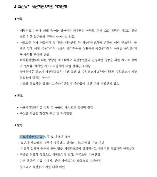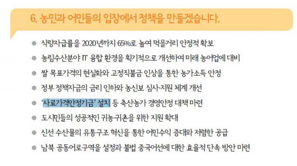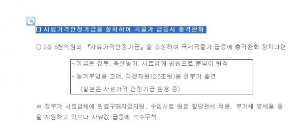 그림1 새누리당 4.11총선 공약중 사료안정기금 조성 공약 내용 (→새누리당 4.11총선 정책공약집 41~42페이지) 새누리당은 농업분야 정책공약 중 <농자재 지원 확대로 농가경영부담> 분야에서 국제곡물가격 급등에 대비한 사료안정기금 설치를 약속했다. 새누리당은 정책공약집을 통해 기금 조성방안으로 정부, 사료업계, 축산농민이 공동으로 조성하는 사료가격안정기금을 마련하겠다고 공약했다. (→새누리당 4.11총선 정책공약집 41~42페이지)