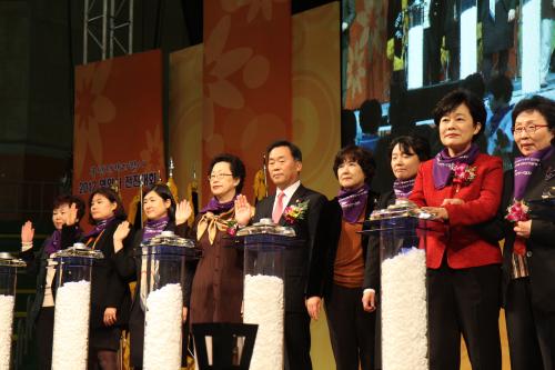 전국 13만 영양사, “한돈 사용 확대 앞장설 것” 결의 참가자들 “매주 월요일은 한돈 먹는 날” 머플러 매고 참석 o 지난 17일 오전 서울 강서구 화곡동 KBS 스포츠월드에서 대한영양사협회(회장 김경주) 주최로 열린 ‘국민건강지킴이 2012영양사 전진대회’에서 참가자들이 한돈농가 보호를 위해 급식현장에서 국내산 돼지고기 사용 확대에 앞장설 것을 결의했다. o ‘대한민국의 건강한 미래, 영양사가 설계합니다’라는 슬로건 아래 개최된 이날 영양사대회에는 13만명의 영양사를 대표해 1만5천여명의 지역대표 영양사가 참석했으며, 대한민국의 건강한 미래를 위한 영양사 사회공헌 실천 결의문을 발표하고 이를 적극 실천하기로 다짐했다. o 이날 영양사들은 4개항의 결의문을 채택했으며, 특히 4개 결의사항중 하나로 “우리는 국내 농수축산물 수급 안정의 일환으로 한돈농가를 보호하기 위해 급식 현장에서 우수한 돼지고기 사용확대에 앞장설 것을 결의한다”고 명시함으로써, 영양사와 한돈농가의 상호협력을 통해 국산 돼지고기 소비확대에 앞장설 것임을 대내외에 천명했다. o 또한 영양사들은 한돈자조금에서 제공한 “건강한 대한민국, 한돈의 꿈!, 매주 월요일은 한돈 먹는 날”이라는 캐츠프레이즈가 새겨진 보라색 머플러를 목에 매고 참석해 주목을 끌었다. o 한돈자조금 이병모 위원장(대한한돈협회 회장)은 이날 전진대회’에 박근혜, 문재인, 안철수(김미경 후보 부인 대신 참석) 여야 대선후보와 함께 주요 내빈으로 참석해 “학교에서 대부분을 보내는 청소년의 식생활 건강이 매우 중요한데 영양사들이 맛좋고 몸에 좋은 한돈의 소비촉진을 위해 앞장서주어 감사하다”고 밝히고, “전국 한돈농가들을 대표해 보다 신선하고 안전한 돼지고기를 생산, 소비자들에게 공급하는데 앞장서겠다”고 말했다. o 이에 앞서 대한한돈협회는 대한영양사협회 등 전국 소비자단체와 단체급식 영양사들에게 ‘대국민 호소문’을 발송하고, 돼지값 하락으로 어려움을 겪고 있는 한돈농가들을 위해 단체급식소에서 국산 돼지고기인 ‘한돈’ 사용을 확대해줄 것을 호소한바 있는데, 대한영양사협회가 이번 전국 규모의 영양사전진대회 결의문을 통해 이에 화답함으로써 여야 대선후보가 지켜보는 가운데 영양사와 한돈농가가 하나되는 광경을 연출했다. o 특히 이병모 회장은 각 도를 대표하는 영양사 지회장들과 함께 청일점으로 연단에 올라 결의문 채택을 함께 했다. |