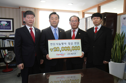 (주)팜스코, 한돈나눔행사 성금 2천만원 기탁 - 정학상 대표이사, 한돈나눔과 사회공헌 통해 상생하자. ![]() (주)팜스코(대표이사 정학상)는 지난 12월 4일 대한한돈협회를 방문하여 이병모 한돈협회 회장에게 한돈나눔행사 성금 2천만원을 기탁했다. (주)팜스코 정학상 대표이사를 대신하여 오명호 마케팅 이사는 한돈나눔행사 성금을 전달하면서 “한돈 소비촉진과 사회공헌 활동의 일환으로 양돈생산자와 관련업계가 함께 추진중인 한돈 나눔행사에 동참해 기쁘다며, 이는 팜스코가 전개하고 있는 지속적인 사회공헌활동(Farmsco Giving-Back project)과도 맥을 같이 한다며, 양돈업계가 힘을 합쳐 지금의 위기를 극복하고, 돼지가격 안정으로 한돈 산업 발전을 위해 협력해 나가겠다”고 강조했다. 이병모 한돈협회장은 “어려운 양돈산업을 위해 애써준데 대해 감사하다고 화답하고, 돈가하락과 불황 속에서도 한돈 소비촉진 계기를 마련하고, 따뜻한 양돈인들의 이웃사랑이 전달될 수 있도록 최선의 노력을 다하겠다”고 화답했다. (주)팜스코는 사료, 계열, 신선식품, 육가공 등 축산식품 전 과정을 시스템화하여 구축하고 있으며, HACCP와 ISO9001 인증을 획득함으로써, 품질 위생, 표준화의 요건을 모두 갖춘 축산전문기업으로 한국 사료업계 및 축산업계의 발전에 크게 기여하고 있다. 이번 한돈협회 한돈나눔행사 기금 전달 등을 필두로 (주)팜스코는 지속적인 사회공헌활동(Farmsco Giving-Back project)을 펼칠 계획이다.