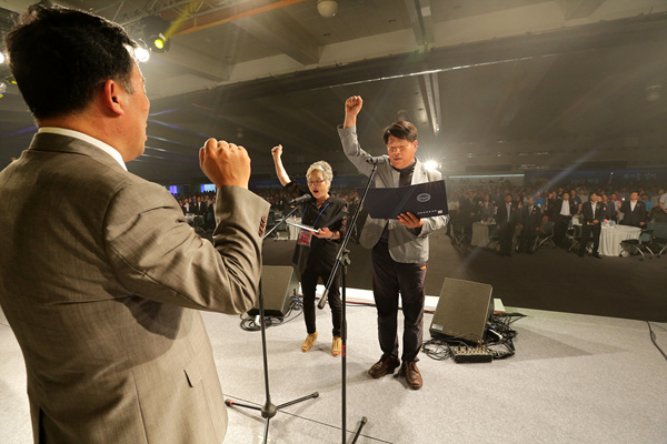 이날 한돈 생산자들은 현재의 위기를 슬기롭게 넘어 한돈산업의 밝은 새 시대를 열기 위한 결의문을 낭독하고 있는 서두석, 진성분 농가대표