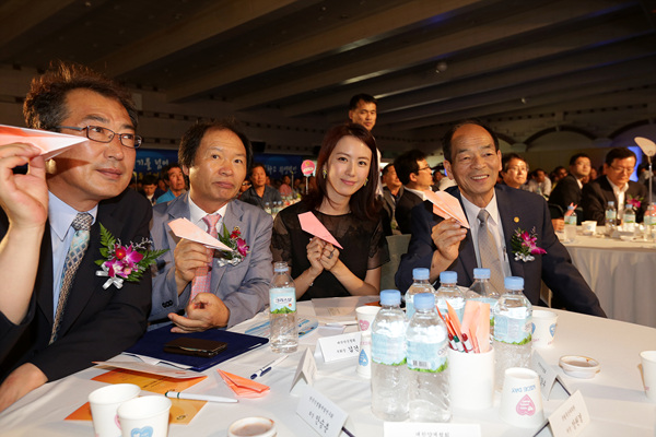한돈홍보대사인 홍은희씨와 한돈인들이 한돈인의 희망을 담은 종이비행기 날리기를 하고 있다.