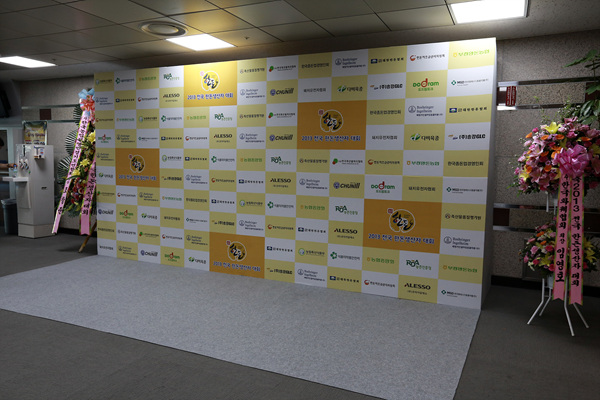 3. 한돈생산자대회를 맞아 전국 9개도를 대표하는 도협의회장단과 깃발들이 무대에 도열했다.