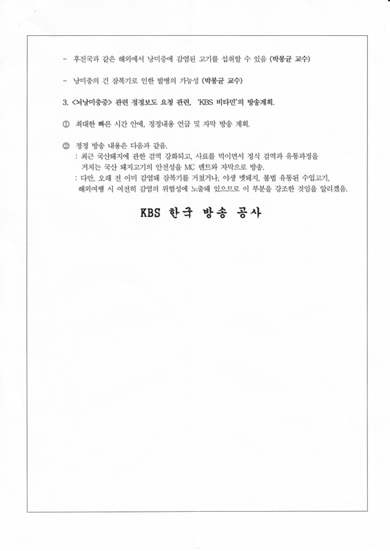 3. <뇌낭미충증> 관련 정정보도 요청 관련, KBS 비타민의 방송계획