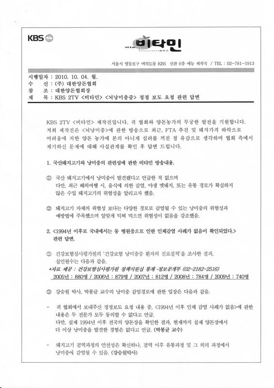 KBS2TV <비타민> 제작진입니다. 귀 협회와 양돈농가의 무궁한 발전을 기원합니다. 저희 제작진은 <뇌낭미충>에 관한 방송으로 최근 FTA 추진 및 돼지가격 하락으로 어려움에 처한 양돈농가에 본의아니게 심려를 끼친 점 유감으로 생각하며, 협회 측에서 제기하신 문제에 대한 사실관계를 확인 후 답변을 드립니다.
