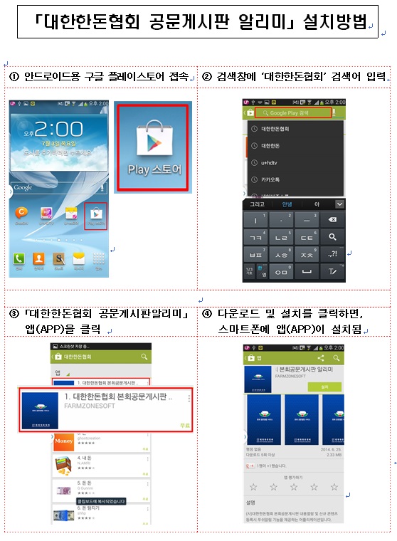 나. 주요 기능 : ○ 앱(APP)을 설치한 경우, 모바일로 공문 열람 및 검색 가능 ○ 중앙회에서 공문열람게시판에 공문을 올릴 경우, APP을 설치한 사용자의 스마트폰에 실시간으로 푸시 알림 메시지가 나타남 ※ 단, 앱(APP) 설치는 스마트폰을 소지하고, 안드로이드용 구글 플레이스토어 접속이 가능해야 함. 다. 사용 대상 : 본회 임원 및 지부(회)장, 사무국장, 사무장 라. 설치 방법 : ○ 안드로이드용 구글 플레이스토어 접속 ⇒ 검색어 ‘대한한돈협회’ 입력 ⇒ 「본회공문게시판 알리미」 앱(APP) 다운로드 및 설치 ※ 자세한 앱(APP) 설치방법은 붙임 참조 ※ 붙임: 「대한한돈협회 공문게시판 알리미」설치방법 1부 “끝”