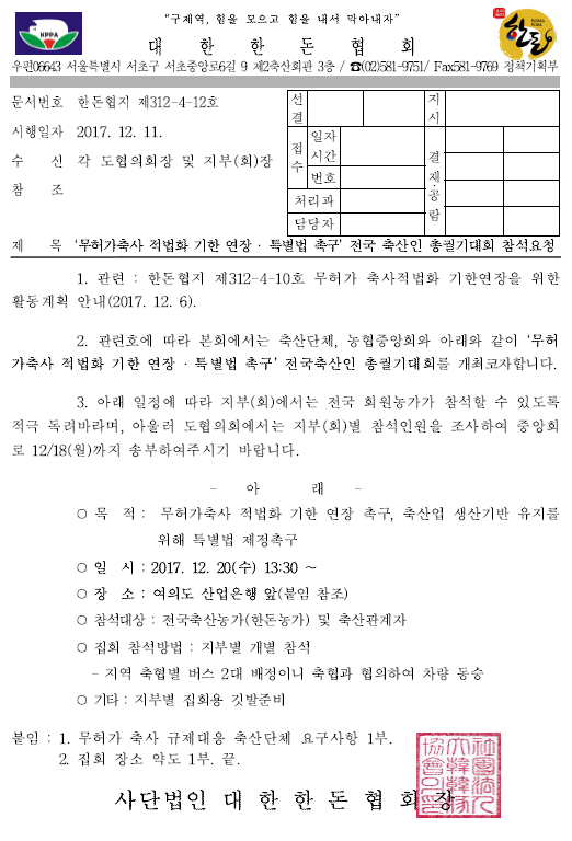 첨부파일 다운로드 312-4-12(시행) ‘무허가축사 적법화 기한 연장 · 특별법 촉구’ 전국 축산인 총궐기대회 참석요청.pdf