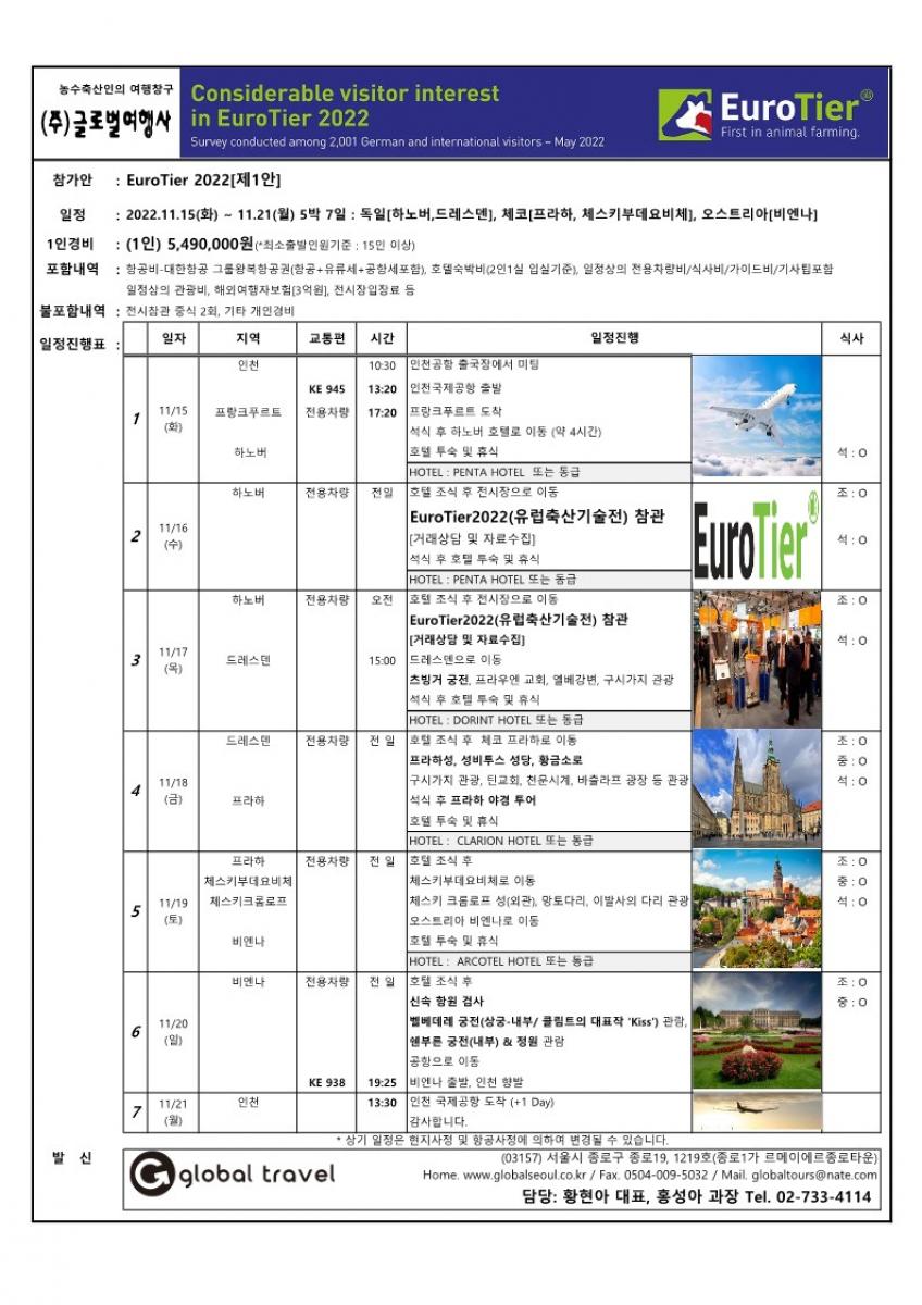 가. 행사명 : EuroTier 2022(유로티어 하노버 축산기술박람회) 참관 나. 전시분야 - 양돈(양돈사육/종축개량/인공수정/돼지유전공학,양돈기자재/돈사설비), 양계(산란/육계/생산가공처리), 낙농(설비/착유시설/원유처리/장비), 가공 및 마케팅, 축산분뇨처리/바이오가스/환경오염제어 기술, 사료(저장·재료장비/첨가제/바이오헬스케어) 등 - Website: https://www.eurotier.com/ 다. 참관기간 : 2022년 11월 15일(화)∼11월 21일(월), 5박 7일 라. 방문장소 - 독일 하노버 전시장. 독일(하노버, 드레스덴), 체코(프라하, 체스키부데요비체), 오스트리아(비엔나) 마. 소요경비 : 1인 5,490,000원(항공비, 숙박비, 식사비, 시찰비용 등 포함, VAT 별도) ※ 불포함 내역 : 전시참관 중식 2회, 기타 개인경비 바. 모집대상 : 한돈농가를 비롯한 업계, 학계 등 축산업 관련 종사자 사. 모집기간 : 2022년 11월 5일(토)까지 아. 신청방법 : 참가 신청서 작성 후 글로벌여행사 팩스 또는 이메일로 회신 - 팩스 : 0504-009-5032 / 이메일 : globaltours@nate.com 자. 기타문의 : 글로벌여행사 황현아 대표, 홍성아 과장 등(전화: 02-733-4114) ※ 참고 : 2023년 주요 행사일정