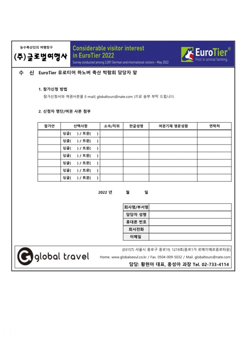 | 첨부파일 | 다운로드 글로벌여행_EUROTIER2022_하노버종합축산박람회_참관(신청서).pdf | |||||||||||||||||