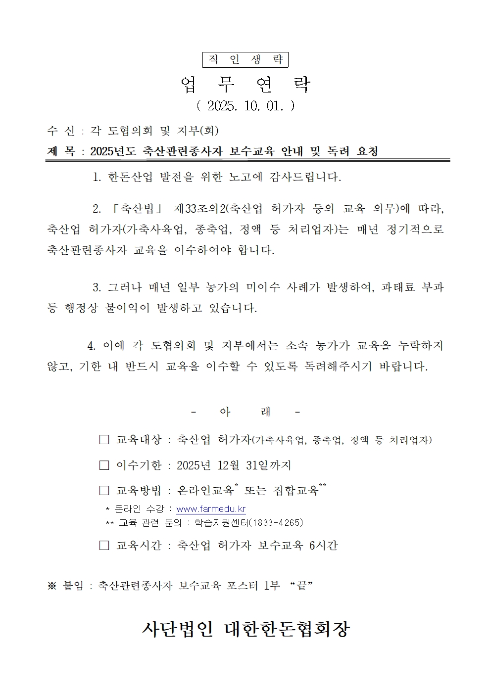 [업무연락] 축산관련종사자 보수교육 안내 및 독려 요청