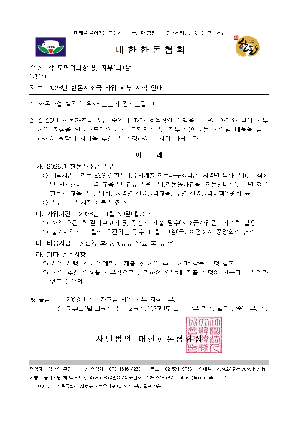 첨부파일 다운로드 342-1(시행) 2026년 한돈자조금 사업 세부 지침 안내 .pdf