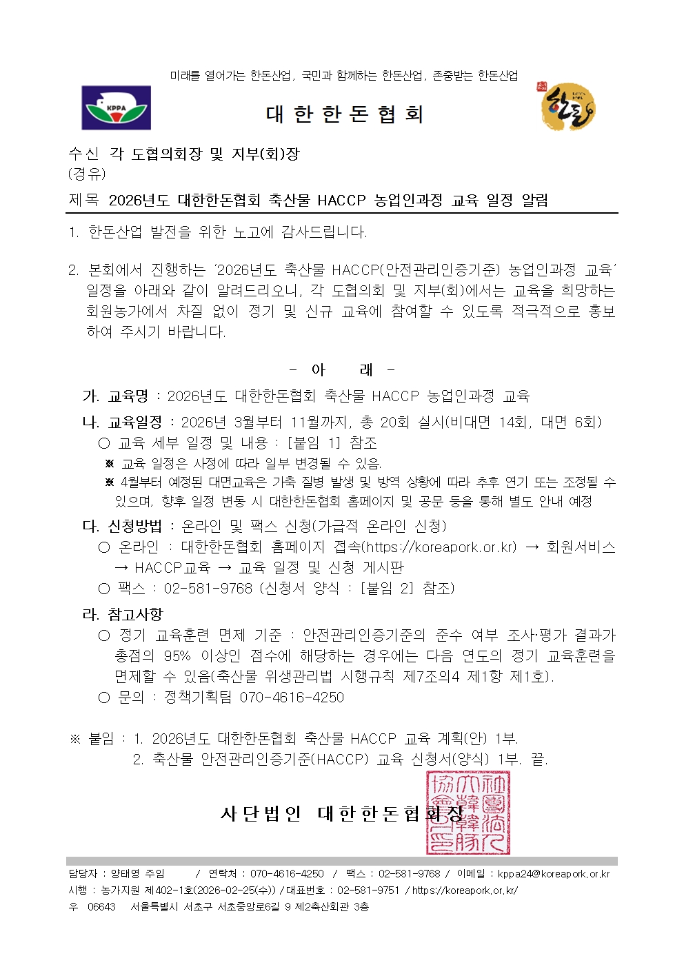 첨부파일 다운로드 402-1(시행) 2026년도 대한한돈협회 축산물 HACCP 농업인과정 교육 일정 알림 .pdf