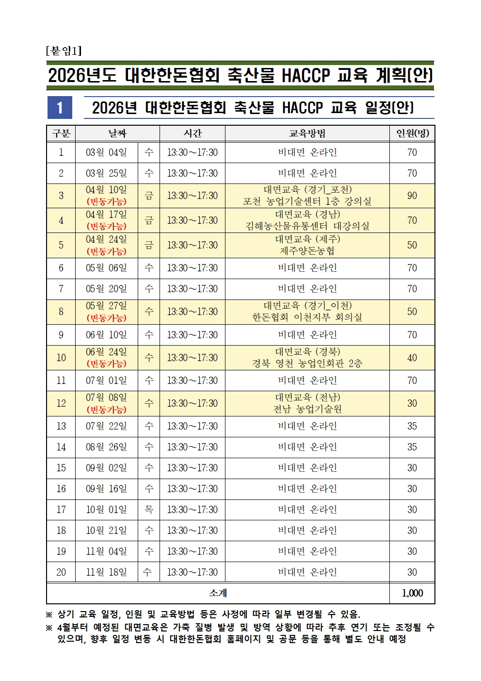 ※ 4월부터 예정된 대면교육은 가축 질병 발생 및 방역 상황에 따라 추후 연기 또는 조정될 수 있으며, 향후 일정 변동 시 대한한돈협회 홈페이지 및 공문 등을 통해 별도 안내 예정.