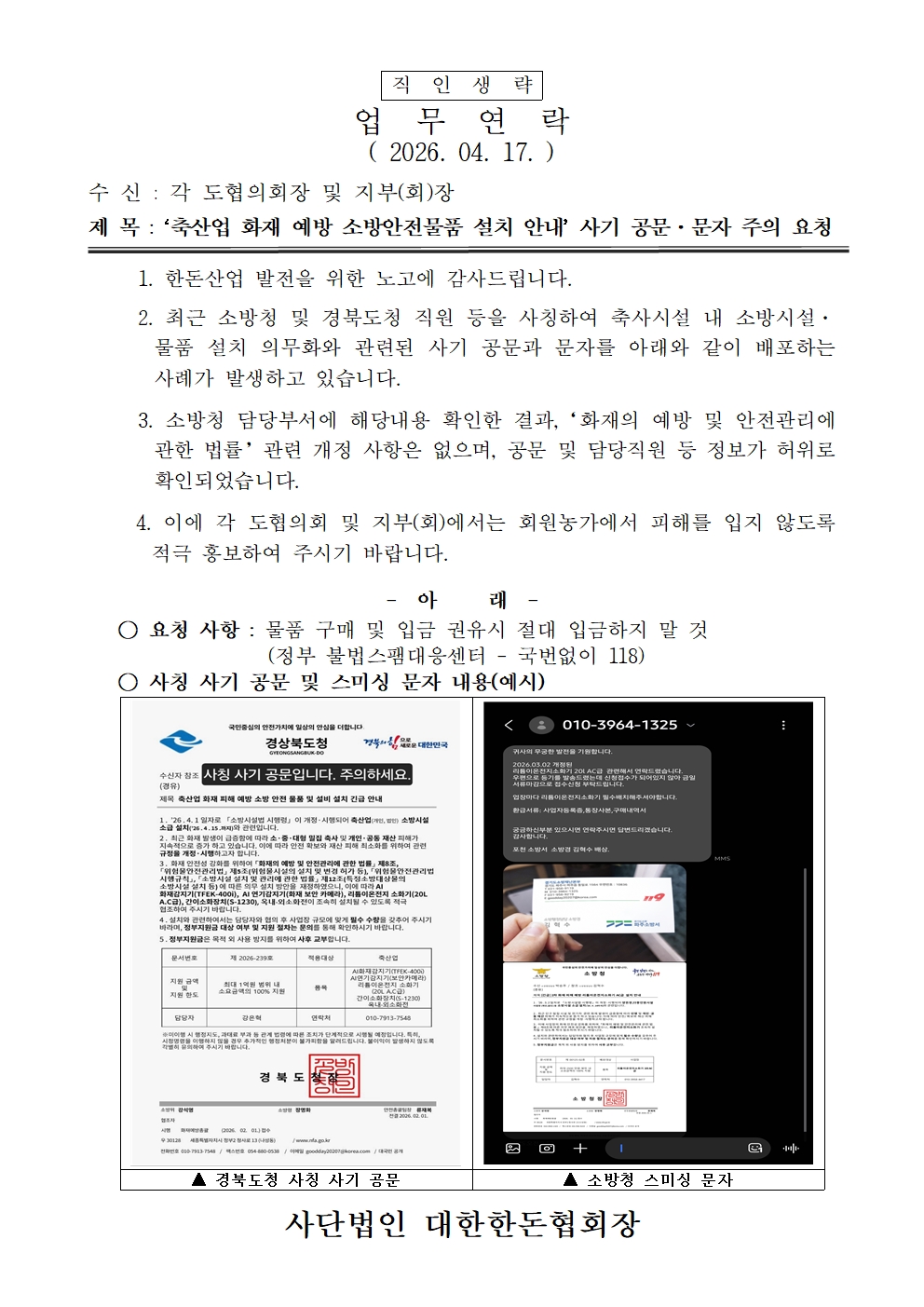 첨부파일 다운로드 (업무연락_260417) '축산업 화재 예방 소방안전물품 설치 안내' 사기 공문·문자 주의 요청.pdf