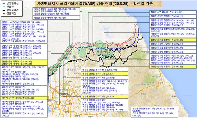 [ASF본부] 화천,연천,파주 멧돼지 폐사체 9개체(3/23,24) ASF바이러스 검출(3/25,누적439건) |