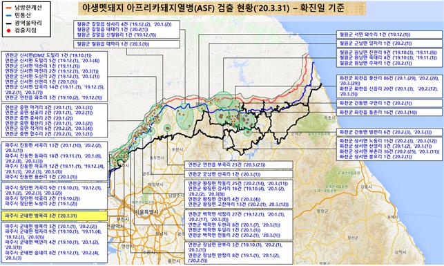 [ASF본부] 파주 멧돼지 폐사체 3개체(3/29) ASF바이러스 검출(3/31,누적470건) |