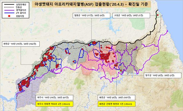 [ASF본부] 화천, 파주 멧돼지 폐사체 3개체(4/2) ASF바이러스 검출(4/3,누적483건) |