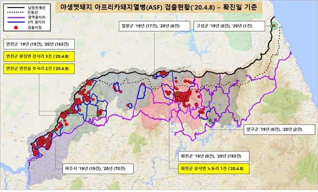 [ASF본부] 화천,연천 멧돼지 폐사체 6개체(4/6) ASF바이러스 검출(4/8,누적496건) |