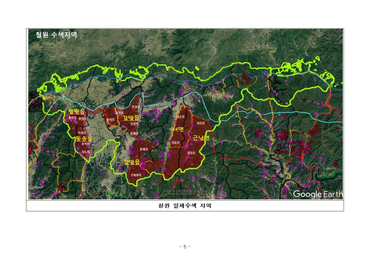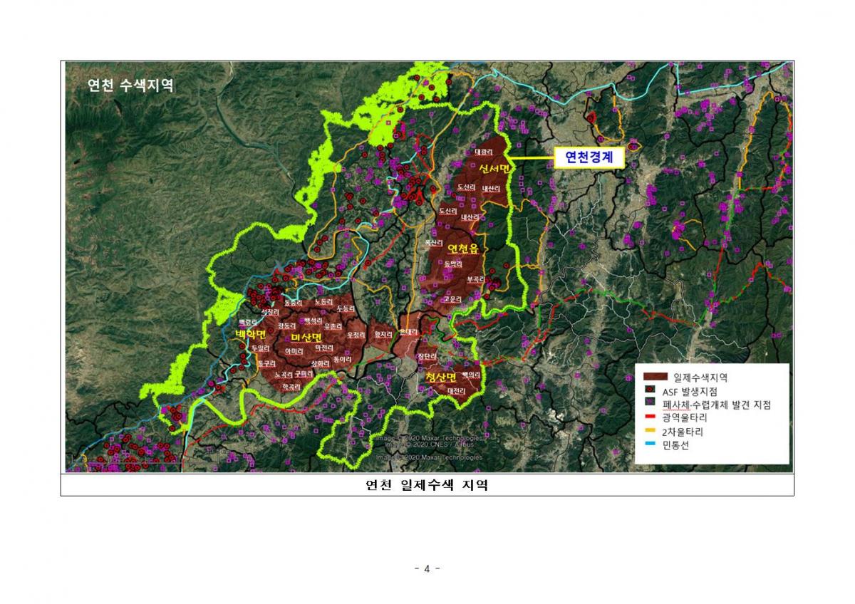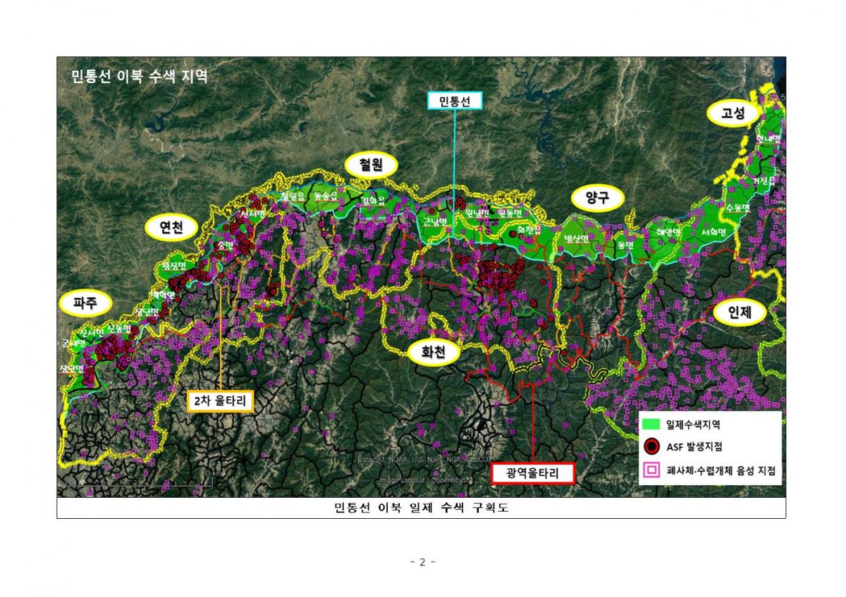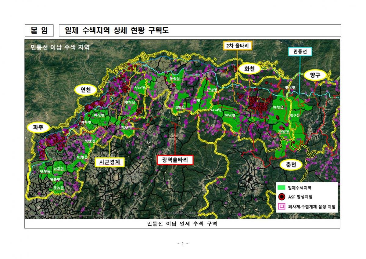 민관군 합동 아프리카돼지열병 멧돼지 폐사체 일제수색 ▷ 발생지역 주변에 대한 선제적 수색으로 멧돼지 ASF 확산차단 및 향후 ASF 대응에 안정적 여건을 만들어 낼 것으로 기대 □ 환경부(장관 조명래)는 야생멧돼지 아프리카돼지열병(ASF) 확산을 차단하기 위해 4월 9일부터 4월 27일까지 환경부, 국방부 등 관계기관이 합동으로 멧돼지 폐사체 일제 수색을 실시한다고 밝혔다. ㅇ 이번 일제수색은 발생지역 및 주변 8개 시군을 81개 구역으로 구획화하여 일정구역을 작은 인원으로 순환 반복해 실시해온 그간의 수색방식을 보완한 것으로서, ㅇ 일정 지역에 대규모 인원을 집중 투입하여, 선제적으로 감염원이 되는 폐사체를 일시에 제거하는 방식으로 실시된다. □ 일제 수색은 발생지역 중 멧돼지 ASF가 확산되어 있을 가능성이 높으나, 접근이 어려워 수색이 미흡했던 산악지대와 코로나19 여파로 수색이 제한되었던 민통선 이북을 대상으로 실시되며, * 파주, 연천, 철원, 화천, 고성, 양구, 인제, 춘천 ㅇ 환경부 수색인력 이외에 군 및 유관기관 인원 약 700여명이 참여한다. * (민) 환경부 고용 수색팀 222명 (관) 유역지방환경청 34명, (군) 해당지역 사단 446명 등 총 702명 ㅇ 파주, 연천 등의 민통선 이남지역은 4.9~4.17까지 환경부 수색인력을 비롯한 민․관․군 합동 인력이 투입되며, 민통선 이북지역은 4.20~4.27까지 환경부 수색인원과 군인력이 합동으로 실시한다. * (민통선 이남) ’20.4.9(목) ∼ 4.17(금) / (민통선 이북) ’20.4.20(월)∼4.27(월) □ 수색은 수색면적에 따라 2~6인 1조로 구성하여 팀별로 투입되며, 수색인원들의 손, 의복, 신발 및 차량바퀴 등에 대한 소독 등 철저한 방역하에 이루어진다. ㅇ 또한, 수색 실시 전 후 집결지에 모여 수색요령 및 안전사항에 대해 교육을 실시하고, 코로나19 대응 수칙에 따라 수색인원 간 적당한 거리 유지, 마스크 착용 등 수칙도 엄격히 지키며 실시될 예정이다. ㅇ 일제수색을 통해 발견된 폐사체는 야생멧돼지 아프리카돼지열병 표준행동지침에 따라 지자체에서 시료 채취 후 현장 소독과 함께 매몰처리한다. □ 이번 민·관·군 합동 일제수색을 통해 감염원이 되는 폐사체를 적시에 제거함으로써 기존 발생지역에서 주변으로의 확산을 막는데 도움이 될 것으로 기대된다. ㅇ 또한, 광역울타리 이남 지역에서 추진 중인 멧돼지 집중포획을 병행함으로써 향후 안정적인 상황에서 멧돼지 ASF를 대응할 수 있는 여건을 조성할 것으로 기대된다. ㅇ 조명래 환경부장관은 “코로나19 등 어려운 여건에서도 멧돼지 아프리카돼지열병 확산 차단을 위해 일제수색에 적극 협조하는 국방부와 관계기관에 감사의 말씀을 드린다”라며, “일제 수색 이후에도 수색을 지속하여 질병 확산을 막기 위해 총력을 다할 것”이라고 말했다. 붙임 : 일제수색 상세현황 구획도.