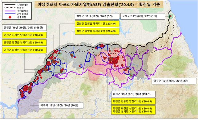 [ASF본부] 화천,철원,연천 멧돼지 폐사체 10개체(4/7) ASF바이러스 검출(4/9,누적506건) |
