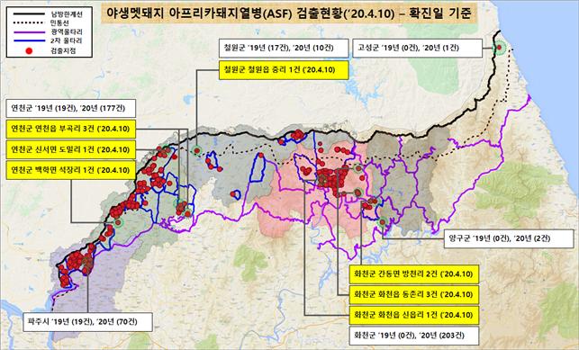 [ASF본부] 화천,철원,연천 멧돼지 폐사체 12개체(4/8,9) ASF바이러스 검출(4/10,누적518건) |