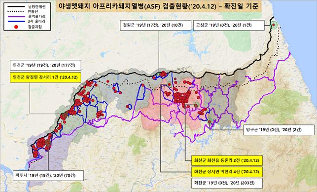[ASF본부] 화천,연천 멧돼지 폐사체 7개체(4/10) ASF바이러스 검출(4/12,누적525건) |