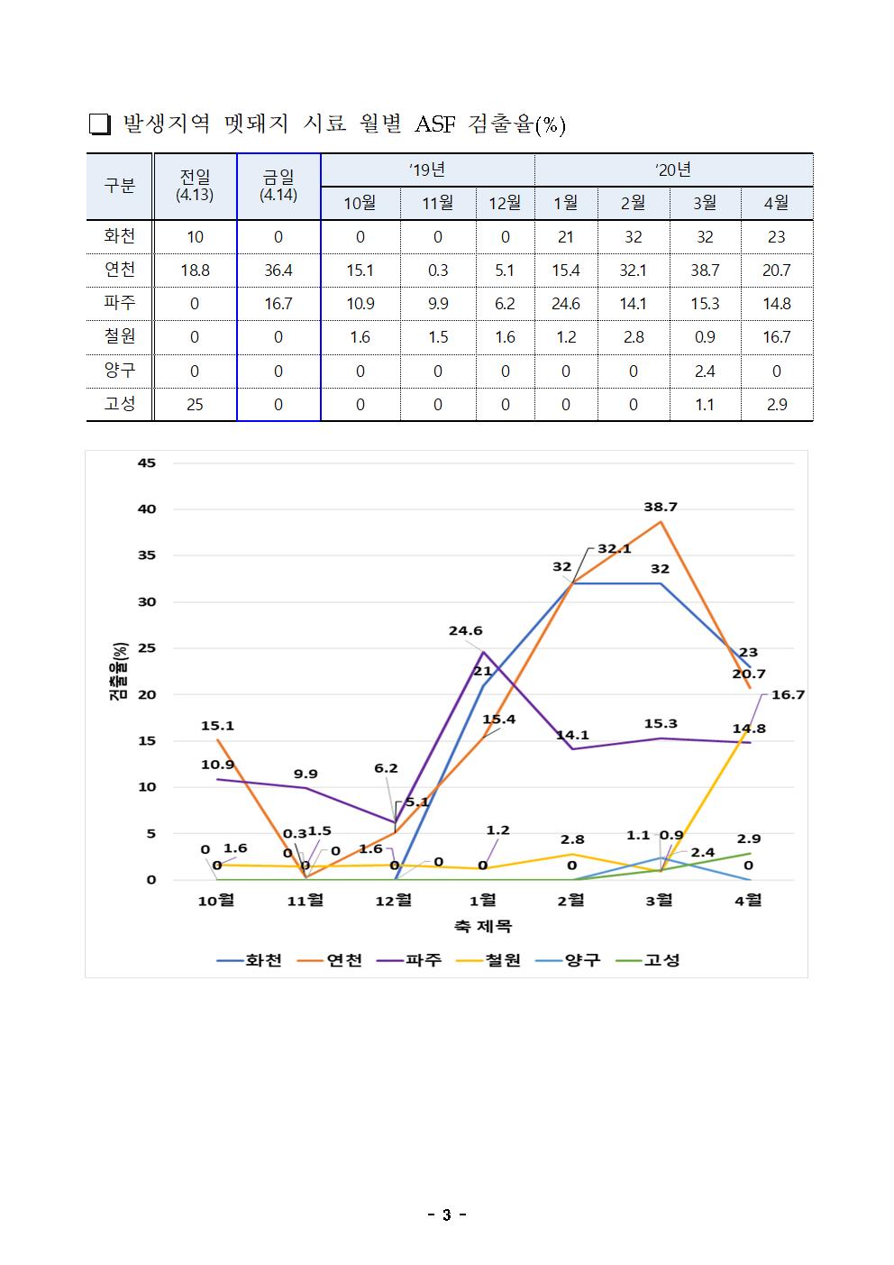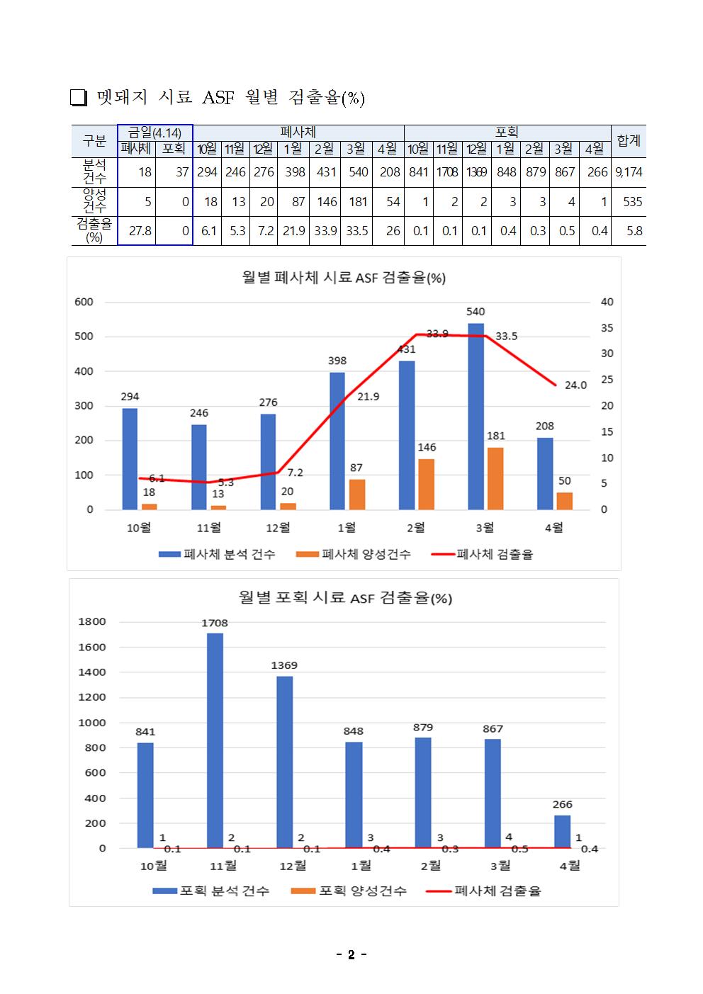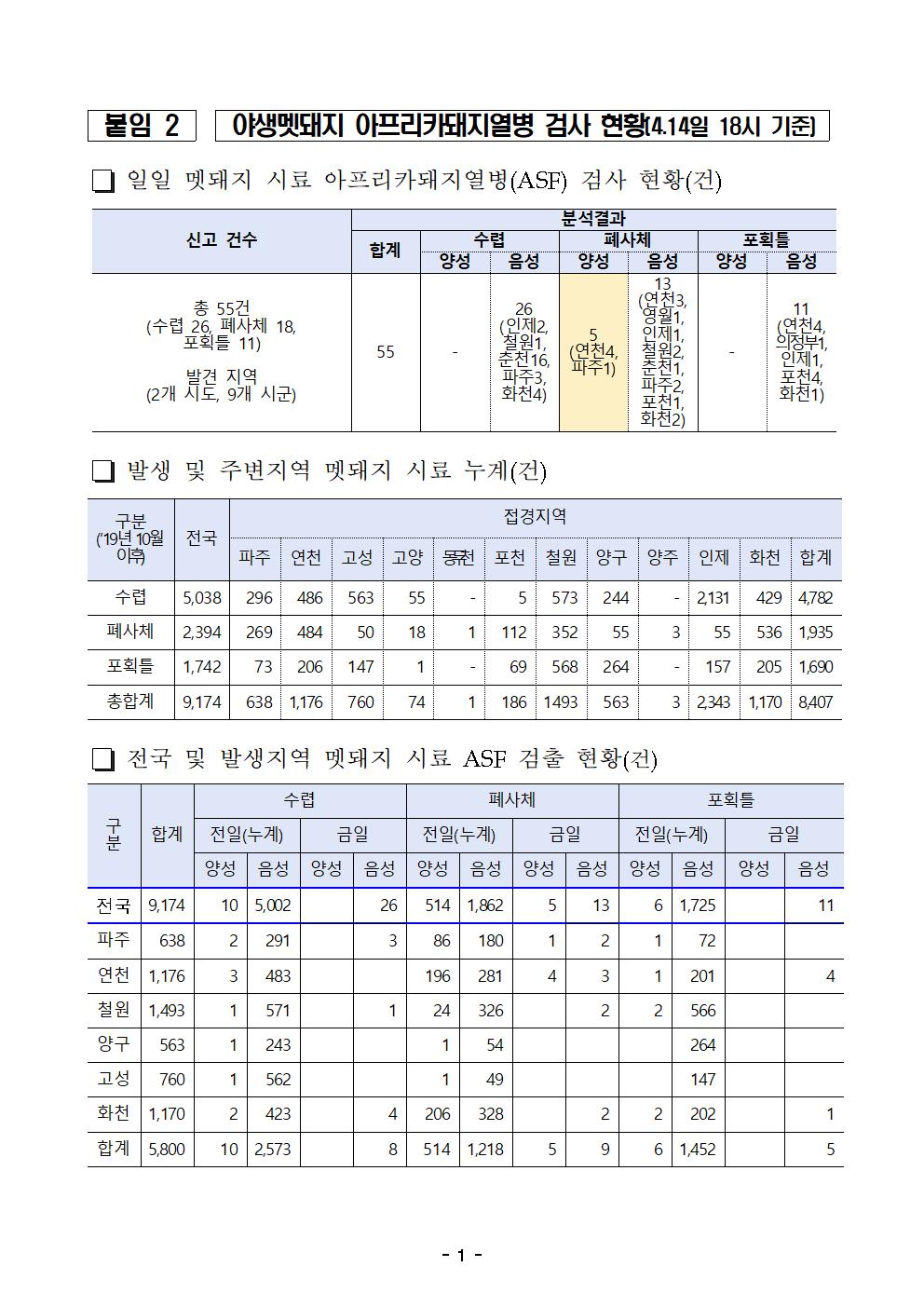 [ASF본부] 파주,연천 멧돼지 폐사체 5개체(4/13) ASF바이러스 검출(4/14,누적535건) |