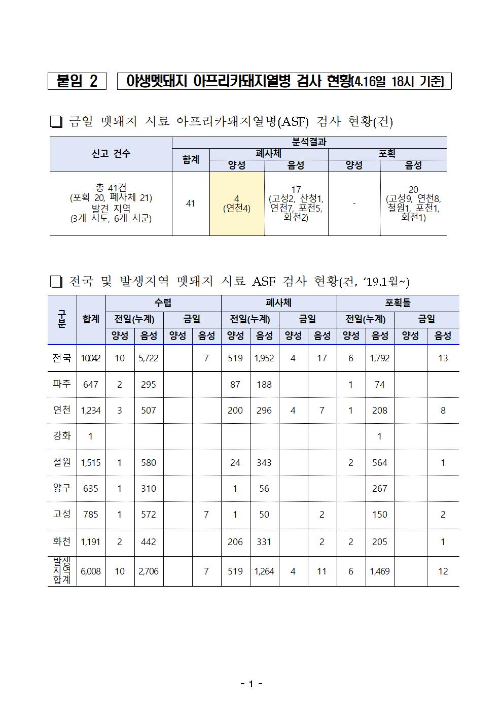 | 첨부파일 | 다운로드 (환경부 4.16) 경기 연천군 멧돼지 아프리카돼지열병 검출(1).hwp | ||
