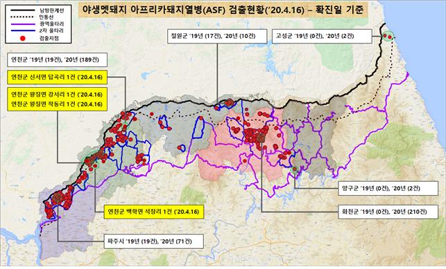 [ASF본부] 연천 멧돼지 폐사체 4개체(4/14,15) ASF바이러스 검출(4/16,누적539건) |