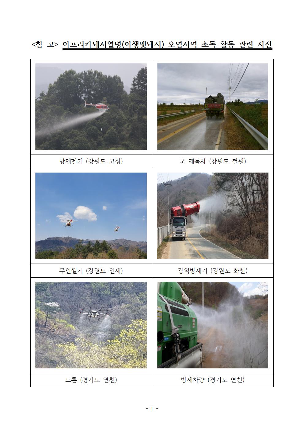 양돈농장 고용 외국인근로자 방역수칙 교육․홍보 강화 - 15개국 다언어로 번안된 방역수칙․문자 전송, 교육․홍보 동영상 보급 등 - << 주 요 내 용 >> ▷ 아프리카돼지열병(ASF) 중수본은 봄철 매개체 활동이 활발해짐에 따라 매개체․차량․사람을 통해 바이러스가 사육돼지로 전파되는 것을 차단하기 위해 방역관리 강화방안을 마련하여 총력대응 중 ▷ ①접경지역 오염원 제거를 위한 광범위한 소독(3.16보도)을 시작으로 ②매개체 관리를 위한 전문업체 구충․구서 지원 등 축산환경 개선(4.17), ③ 접경지역 축산차량 출입통제(4.21)를 추진하는데 이어 금번 ④외국인근로자 방역수칙 교육․홍보 강화에도 집중할 계획임 □ 중수본은 아프리카돼지열병(ASF) 예방을 위해 국내 양돈농장에 고용된 외국인근로자(15개국, 5,583명)를 대상으로 아프리카돼지열병(ASF) 방역수칙 등 관련 교육․홍보 강화를 추진 ○ 외국인근로자의 각 국적에 맞춰 15개국 다언어로 ASF 방역수칙 등을 제작하여 관련 기관․단체에 보급(2020.2월) - 외국인근로자의 각 국적에 맞는 ‘다언어 문자(MMS)’를 본인 휴대폰으로 매주 1회 이상 전송(2020.2월~, 연중 계속) - 방역수칙 준수 여부를 스스로 점검할 수 있게 구성한 15개국 다언어로 제작된 ‘자체 점검 체크리스트’를 보급(2020.3월) ○ 컨텐츠 다양화를 위해 ‘다언어 홍보영상’ 보급 예정(2020.5월) ⇒ 중수본은 농장주․관리자는 외국인근로자가 방역수칙을 정확하게 인지하고, 반드시 준수토록 지도하는 등 주의를 당부함 << 세 부 내 용 >> □ 아프리카돼지열병(ASF) 중앙사고수습본부(본부장 : 김현수 농식품부 장관)는 봄철 매개체 활동이 활발해짐에 따라 매개체․차량․사람을 통해 바이러스가 양돈농장으로 전파될 위험을 차단하고자 방역관리 강화방안을 마련하여 총력 대응하고 있다. ○ 첫째, 접경지역 ‘오염원 제거’를 위해 야생멧돼지 검출지역과 주변 수계․도로 및 출입 차량과 사람에 대한 소독을 강화하였다. - 특히, 방제차량 접근이 곤란한 지역에는 산림청헬기․무인헬기․드론 및 인력 등 가용한 자원을 집중 투입하였다(붙임 참고). ○ 둘째, ‘매개체’에 의한 전파를 막기 위해 4월 한달동안 접경지역 395개 농가에 전문업체를 통한 구충․구서를 지원하고, - 4.16일부터 수요일 마다 전국 양돈농가 축사 내․외부 소독․방역․청소 등을 동시에 실시하는 축산환경 개선의 날을 운영하고 있다. ○ 셋째, 5.1일부터 ‘축산차량 출입통제’를 시행하여 주요 전파원인인 축산차량이 양돈농장에 출입하는 것을 원칙적으로 금지한다. - 차량출입 금지가 불가능한 경우 진입한 차량과 사육시설을 분리하는 내부울타리를 설치하고, 사람이 환복․소독하는 방역실을 설치한다. □ 중수본은 네번째 대책으로 사람에 의한 바이러스 전파를 막기 위해 양돈농장에 고용된 외국인근로자에 대한 ‘방역수칙 교육․홍보’에 집중할 계획이다. ○ 농장주․관리자와 내국인근로자의 경우 수시 배부되는 한글판 자료로 ASF 방역수칙 등 관련 정보를 쉽게 접할 수 있지만, ○ 외국인근로자는 한글판 자료를 읽고 이해하기 어려워 농장주․관리자 등으로 부터 전해 듣는 정도로 교육․홍보의 사각지대가 될 수밖에 없는 문제가 있었다. ※ 외국인근로자 고용현황 : 전국 양돈농장 6,066호 중 1,727호에 15개국 5,583명 • (국적 : 15개국) 네팔, 캄보디아, 태국, 베트남, 미얀마, 중국, 인도, 몽골, 스리랑카, 필리핀, 우즈베키스탄, 대만, 인도네시아, 동티모르, 라오스 □ 중수본은 이러한 문제를 해소하기 위해 올해 외국인근로자의 국적에 맞춰 15개국 다언어로 ASF 방역수칙을 작성하였다. ○ ‘다언어 방역수칙’은 전국 지자체와 한돈협회 등 생산자단체, 가축방역기관 누리집(홈페이지)에 게시하고, 현장지도 시 활용토록 하였다. ※ 아프리카돼지열병(ASF) 방역 기본수칙(예시) • (매개체) 생석회 벨트구축, 울타리·기피제 설치, 퇴비장 방조망 설치, 주기적 구충·구서, 사료빈 및 퇴비장 청소·소독, 돈사 방충망 설치 등 • (차량·물품) 축산차량 농장진입 통제, 경운기·트렉터 등 농장외부 장비 반입 금지, 차량 출입 시 세척·소독, 농장 내 물품 소독 후 보관 등 • (사람) 외부인 출입금지, 대인소독시설·발판소독조 설치, 출입자 기록, 돈사 출입 시 손 씻기, 전실설치, 돈사전용 장화 갈아신기 등 □ ASF 방역수칙을 외국인근로자의 각 국적에 맞는 ‘다언어 문자(MMS)’를 본인의 휴대폰으로 매주 1회 이상 전송하고, ○ 농장주․관리자에게도 동일한 내용의 한글문자를 동시 전송하여 공유할 수 있게 진행하고 있다. ○ 외국인근로자가 방역수칙 준수 여부를 자가 점검할 수 있는 15개국 다언어로 된 ‘자체점검 체크리스트’도 제작하여 보급하였다. □ 이 밖에도 교육․홍보 컨텐츠 다양화를 위해 방역수칙을 5개국으로 된 ‘다언어 홍보영상’을 제작 중에 있으며, ○ 실제 교육․홍보 현장에서 활용할 수 있도록 5월 중 각 관련 기관 등에 보급할 계획이다. □ 중수본은 다언어 교육․홍보 성과를 중간점검하는 차원에서 4월 한달 동안 전국 양돈농장의 외국인근로자를 대상으로 ‘방역수칙 인식수준 조사