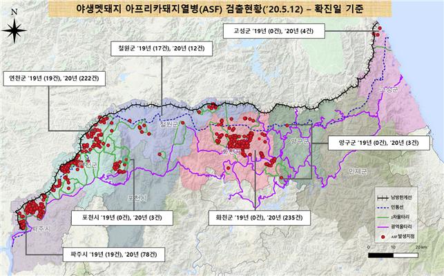 야생멧돼지 아프리카돼지열병(ASF) 발생현황(5월 7일~12일) 및 경향분석 □ 환경부(장관 조명래)는 지난 6일간(5월 7일~12일) 경기도 연천군, 포천시와 강원도 화천군, 고성군에서 아프리카돼지열병 8건이 추가로 발생하여 현재까지 총 612건*이 발생했다고 밝혔다. * 파주 97건, 연천 241건, 철원 29건, 화천 235건, 양구 3건, 고성 4건, 포천 3건 ○ 이 기간(5월 7일~12일) 환경부 소속 국립환경과학원에서 검사한 멧돼지 시료는 총 171건으로, 이 중 폐사체 시료가 71건, 포획개체 시료가 100건이었다. ○ 양성이 확진된 8건 중 7건은 폐사체 시료, 나머지 1건은 고성군 현내면 명호리에서 포획된 포획개체 시료였다. □ 양성이 확진된 폐사체 및 포획개체는 모두 2차울타리 또는 광역울타리 내에서 발견되었으며, 포획개체 1건은 포획틀 점검을 실시하던 군 장교가, 나머지 폐사체 7건은 환경부 수색팀 및 영농인이 발견하였다. ○ 폐사체는 야생멧돼지 아프리카돼지열병 표준행동지침에 따라 시료 채취 후 현장 소독과 함께 매몰하여 처리했다. □ 환경부는 확진결과를 관계기관에 통보하고, 발견지점과 발견자 소독, 입산 통제, 주변 도로와 이동차량에 대한 방역 철저 등 대응 강화 조치를 요청하였다. □ 한편, 환경부는 2020년 4월 이후부터 폐사체 수색을 활발히 실시하고 있음에도 아프리카돼지열병의 발생건수가 줄어드는 경향을 보이는 것으로 나타났다고 밝혔다.