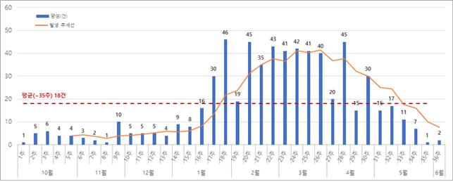 □ 한편, 이 기간(6월 3일~9일) 동안의 주간 발생건수는 2건에 그쳐, 양성개체 발생이 활발했던 지난 3~4월의 평균인 34건과 비교하여 매우 적게 발생하고 있는 것으로 나타났다. ○ 또한, 폐사체 발견건수의 경우에도 지속적으로 줄어들고 있어 3월 326건, 4월 273건에 비해 5월은 139건으로 감소하였다. □ 환경부는 수색인원 확대 등 폐사체 수색을 강화하고 있음에도 최근 양성개체 발생건수가 감소하고 있는 것은 멧돼지 개체수 감소 및 출산 이후 이동성 저하 등 원인에 의한 것으로 분석하고 있다. ○ 개체수 조사 결과, 2019년 10월과 비교해 2020년 5월에 광역울타리 내에서 약 46%, 2차 울타리 내에서는 약 76%의 멧돼지 개체수가 감소한 것으로 추정하고 있다. ○ 아울러, 발생지역 폐사체 시료의 양성검출률도 3월 이후 지속 감소*하고 있어, 멧돼지 집단 내 감염개체의 비율도 줄어든 것으로 분석하고 있다. * (폐사체 양성검출률) 1월 24.9% → 2월 37.1% → 3월 39.6% → 4월 27.5% → 5월 19.0% □ 환경부는 향후 여름철에는 감염원이 될 수 있는 폐사체 발견 등 수색효과가 감소할 것으로 예상됨에 따라, 수색지역 주변 환경시료 검사를 강화하여 확산징후에 조기에 대처할 수 있도록 할 계획이다. ○ 이를 위해 폐사체 수색 시 멧돼지 흔적, 2차 울타리 인근 등 감염우려지역과 하천수 검사를 확대해나갈 계획이다.