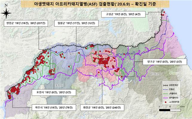 야생멧돼지 아프리카돼지열병(ASF) 발생상황 및 동향 분석 【 주간 발생상황 】 □ 환경부(장관 조명래)는 지난 일주일(6월 3일~9일) 중, 6월 5일과 9일에 경기도 연천군에서 아프리카돼지열병 2건이 추가로 발생하여 현재까지 총 633건*이 발생했다고 밝혔다. * 파주 98건, 연천 256건, 철원 29건, 화천 240건, 양구 3건, 고성 4건, 포천 3건 ○ 이 기간 동안 환경부 소속 국립환경과학원에서 검사한 멧돼지 시료는 총 175건으로, 포획개체 시료가 129건, 폐사체 시료가 46건이었으며, 양성이 확진된 2건은 모두 폐사체 시료였다. □ 양성이 확진된 폐사체는 각각 연천군 신서면과 연천읍의 2차 울타리 내에서 영농인과 환경부 수색팀이 발견하여 신고한 것으로, 야생멧돼지 아프리카돼지열병 표준행동지침에 따라 시료채취 후 현장 소독과 함께 매몰하여 처리하였다. ○ 환경부는 확진결과를 지자체 등 관계기관에 통보하고, 발견지점 및 발견자 소독, 발생지점 출입 통제, 주변 도로와 이동차량에 대한 방역 강화 조치 등을 요청하였다. 【 발생 감소동향 분석 】