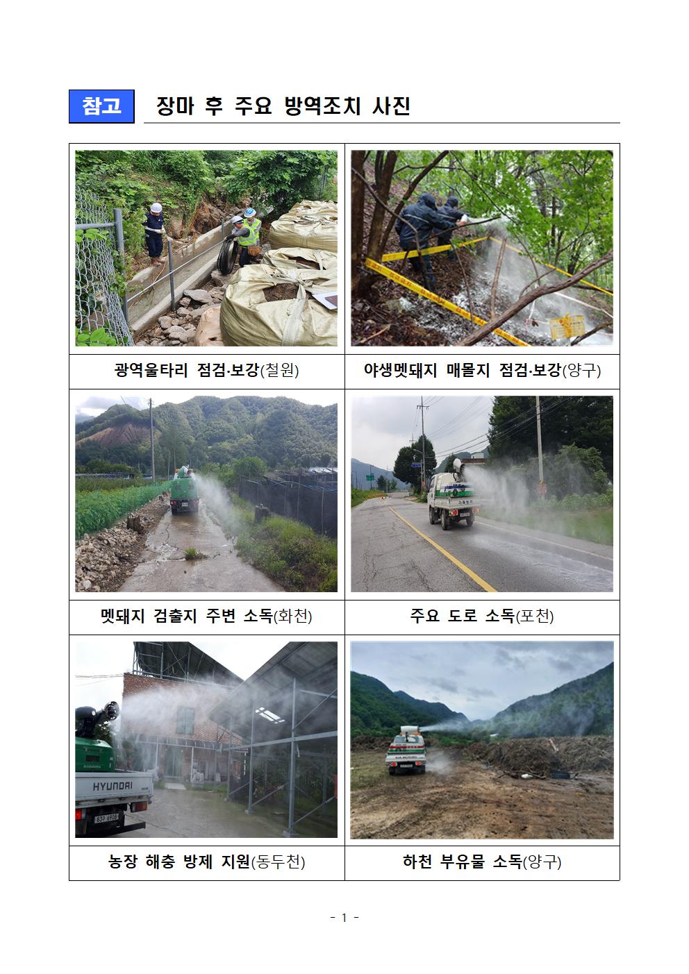 중수본, 장마 후 아프리카돼지열병 확산 예방에 총력 대응 - 일제 소독, 하천 부유물 제거 등 비 그친 뒤 오염원 제거 개시 - □ 아프리카돼지열병(ASF) 중앙사고수습본부(본부장: 김현수 농식품부 장관)는 장마 후 아프리카돼지열병 확산 예방에 총력을 기울인다. □ 중수본은 야생멧돼지 아프리카돼지열병이 지속 발생*하는 등 접경지역의 바이러스 오염 확산이 우려되는 상황에서, * 경기·강원 북부 7개 시·군(연천·화천·파주·철원·포천·고성·양구)에서 총 701건 발생(8.13.기준) ○ 최근 중부지방을 비롯해 전국에 많은 비가 내려 접경지역 하천을 따라 야생멧돼지 폐사체와 같은 오염된 부유물이 확산되고, ○ 이러한 오염원과 접촉한 차량, 사람, 매개체(쥐·모기·파리 등)를 통해 양돈농장으로 바이러스가 유입될 위험이 높다는 판단이다. □ 이에 중수본은 사육돼지로 ASF가 확산되지 않도록 장마 후 ①야생멧돼지 울타리·매몰지·포획틀 점검, ②하천 주변·도로 일제 소독, ③농장단위 방역조치, ④하천 부유물 제거를 대대적으로 실시한다. ○ 17일부터 기상 상황에 따라 장마가 끝난 뒤 바로 일제 소독 등 방역조치를 이행하고, 장마가 진행중인 지역은 비가 그친 뒤 즉시 인력·차량·장비가 투입되도록 준비에 만전을 기한다. [ 야생멧돼지 대응 시설물 점검 ] □ 먼저, 야생멧돼지 차단 울타리와 양성개체 매몰지, 포획틀 등 대응 시설물을 일제히 점검하여 이번 집중호우로 인해 훼손된 부분을 확산 우려가 높은 지역부터 일주일 내 신속히 보강한다. ○ 손상·침수 등 피해가 발생한 2차·광역 울타리는 강우 종료 직후 지방청-현장상황실-지자체-국립생태원 합동점검을 실시하고, - 2차 울타리는 지자체, 광역울타리는 환경부에서 긴급 복구팀을 구성·운영*하여 손상 구간에 대한 신속한 복구를 추진한다. * (2차 울타리) 파주, 연천, 포천, 철원, 화천, 양구, 고성 7개 시·군 총 43명 * (광역 울타리) 국립생태원(광역울타리 유지관리기관)과 관리업체 총 24명 - 특히, 광역울타리 중에서도 아프리카돼지열병 확산 차단을 위해 관리 중요도가 높은 최남단 구간*에 우선 복구팀을 배정하여, * (최남단 구간) 파주∼연천∼포천∼화천∼춘천∼양구∼인제∼고성 연결 269km - 포천 창수면(보장산 일대), 화천 사내면(두류산 이남) 등 확산 위험 구간부터 복구를 추진할 계획이다. ○ 야생멧돼지 양성개체 매몰지는 지자체-현장상황실 등과 합동점검을 실시하여 강우 이후 매몰상태를 확인하되, - 매몰지가 집중된 지역(연천·화천)에 대해서는 폐사체 수색인력을 활용한 긴급점검반을 편성·투입*하여, 신속히 점검한다. * 연천군 수색인력 55명, 화천군 64명 양성매몰지 점검에 투입 - 하천 인근, 발생지역 최남단 등 위험도가 높은 매몰지(47개소)부터 우선 점검을 실시하고, 점검 후에는 소독 전담팀을 투입하여 매몰지 방역 및 보강도 병행 실시한다. ○ 포획틀·트랩의 경우에도 장마동안 손상되거나 미끼먹이 등이 부패하였을 수 있으므로, 시·군별 전담관리인력(102명)을 통해 관리상태를 점검하고, - 이번 집중호우로 인한 울타리 손상구간에 포획틀·트랩을 집중 배치하여 복구 과정에서도 추가 확산이 없도록 만전을 기한다. [ 하천 주변·도로 등 일제 소독 ] □ 두 번째로, 장마가 끝난 다음 날을 “일제 소독의 날”로 임시 지정하여 야생멧돼지 양성개체 발견지점 일대와 하천 주변, 주요 도로, 농장 주변·진입로 등을 대대적으로 소독한다. ○ 지자체·농협·군부대 등에서 광역방제기, 군 제독차량 등 가용한 방역차량을 일제히 투입하고(960여 대 동원), ○ 산지, 하천 주변 등 차량 진입이 어려운 곳은 인력과 방제 드론을 활용하여 소독을 실시한다.