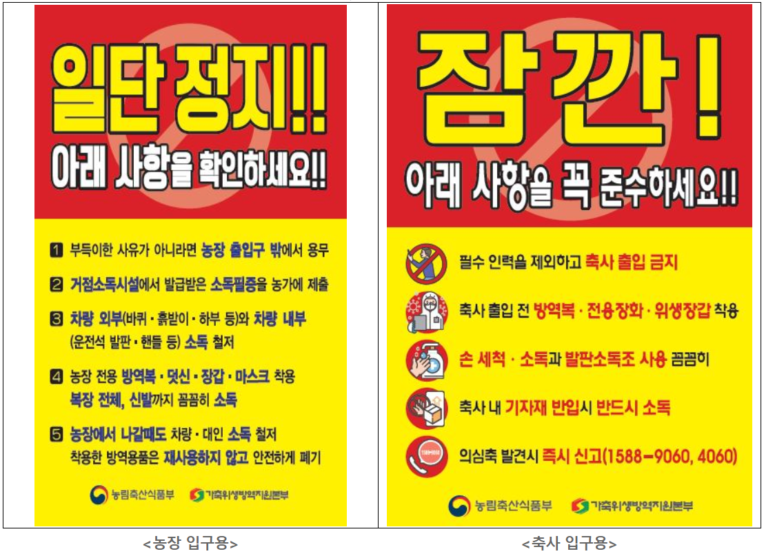 아프리카돼지열병(ASF) 방역 추진상황 (2020.10.25.) □아프리카돼지열병 중앙사고수습본부(이하 ‘중수본’)는 10월 21일부터 26일까지 접경지역 양돈농장 397호에 대한 ‘제3차 정밀검사’를 실시하고 있으며, ○10월 24일(24시 기준), 397호 중 312호의 시료 채취를 완료하였고, 검사가 완료된 286호는 모두 음성으로 확인되었다.(나머지는 검사중) - 또한 시료 채취 과정 중 실시된 임상검사에서도 특이사항은 발견되지 않았다. ○10월 24일, 경기·강원지역 양돈농장 1,245호에 대한 전화예찰 결과에서도 아프리카돼지열병 의심축은 발견되지 않았다. □중수본은 10월 24일, 최근 야생멧돼지 아프리카돼지열병 양성개체가 발견(10.22)된 화천군에 대한 집중 소독을 실시하였다. ○화천군의 야생멧돼지 검출지점과 인근 도로 및 양돈농장(화천군 소재 12호) 주변 등을 소독(군제독차, 광역방제기, 소독차량)하였고, -연막 소독차를 동원해 양돈농장 주변에 대한 해충 방제작업도 실시하였다. □중수본은 야생멧돼지 아프리카돼지열병 양성개체 발견에 따라 화천군 내의 양돈농장(12호)에 대해 재점검을 실시중이다. ○울타리 등 방역시설 설치여부, 생석회 도포·돈사 소독 상태 등을 집중 점검하고, 농장 차단방역을 위한 방역수칙에 대한 현장지도도 병행하고 있다. □중수본은 농장과 축사 입구에 부착할 수 있는 ‘방역 안내판’을 제작하여 전국의 양돈농장 6,066호와 전업 규모 가금농장 4,280호에 배포하고 있다. ○①농장 입구용은 차량 내·외부 소독 등 농장 방문객의 준수사항 5가지, ②축사 입구용은 방역복 착용 등 농장 종사자의 준수사항 5가지를 안내하고 있다.
