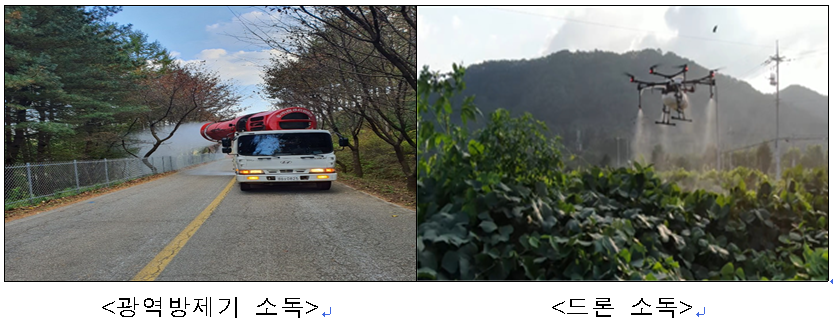 □농림축산식품부(이하 ‘농식품부’)는 지자체·방역본부·국방부·농협의 소독차량(소독차·군제독차·광역방제기) 뿐 아니라 농진청(드론), 들녘경영체(광역방제기) 등의 협조를 통해, 가용한 소독자원을 총 동원하여 고병원성 조류인플루엔자 발생지역과 전국 철새도래지 및 인근 가금농장 등에 대한 집중소독을 실시중이다. ○10월 26일 곡교천·봉강천·풍세천에 소독차량 12대(광역방제기 1, 소독차 11) 및 드론 5대를 투입하여 도래지 반경 10km 및 인근 농장(188호)을 철저히 소독 하였고, -전국 철새도래지 103개소(인근 가금농장 2,463호)에 대해서는 10월 23일부터 25일까지 3일간에 걸쳐, 총 738대의 소독차량(광역방제기 219·소독차 504·군제독차 9·살수차 6, 누적 기준)과 드론 24대(누적 기준)를 투입하여 소독하였다.
