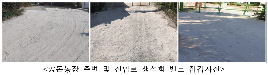주요 가축전염병 방역 추진상황 (2020.11.3.) □ 아프리카돼지열병 중앙사고수습본부(이하 ‘중수본’)는 11월 2일, 한돈협회와 협업하여 접경지역 양돈농장 395호를 대상으로 주말 동안 내린 비에 영향을 받은 생석회 벨트를 보강하였다.
