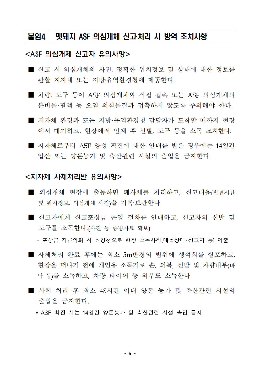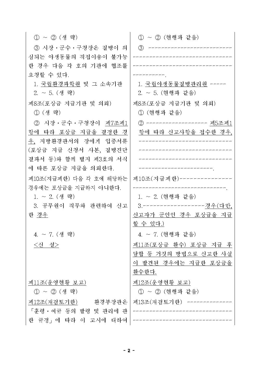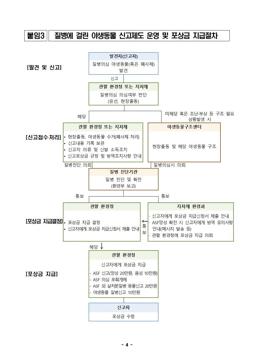 아프리카돼지열병 신고포상금 지급에 관한 규정 개정·시행(11.20) - 11월 12일~18일까지 야생멧돼지 아프리카돼지열병 13건 발생, 누적 804건 □ 환경부(장관 조명래)는 11월 20일부터 야생멧돼지 ’아프리카돼지열병 신고 포상금 제도‘ 개선을 위해 ’질병에 걸린 야생동물 신고제도 운영 및 포상금 지급에 관한 규정‘(환경부 고시)을 일부 개정·시행한다. ○ ’야생멧돼지 아프리카돼지열병 신고 포상금 제도‘는 아프리카돼지열병 발생 초기에 주민들의 관심과 신속한 신고를 유도하여 아프리카돼지열병 감염 폐사체를 조기에 제거하기 위한 목적으로 시행해 왔다. □ 주요 개정내용은 다음과 같다. ○ 포상금 지급 후 거짓으로 신고한 사실이 발견된 경우에는 포상금을 환수할 수 있는 근거를 마련했다. ○ 또한, 군사지역에서 양성개체가 자주 발생하는 특성을 고려하여 군인이 신고하는 경우에도 포상금을 지급할 수 있도록 했다. ○ 아울러, 아프리카돼지열병 대응 초기와 달리 전담 폐사체 수색팀이 체계적으로 운영되고 있고, 최근 양성 발생건수와 멧돼지 개체수가 대폭 감소하였다는 점을 고려하여 양성 폐사체 신고 포상금을 기존 100만 원에서 20만 원으로 조정했다. ○ 이번에 시행되는 ’질병에 걸린 야생동물 신고제도 운영 및 포상금 지급에 관한 규정‘의 자세한 내용은 환경부 누리집(www.me.go.kr) 법령정보 및 법제처 국가법령정보센터(www.law.go.kr)에서 확인할 수 있다. □ 또한, 환경부는 ’야생멧돼지 아프리카돼지열병 표준행동지침‘ (10월 23일 개정)에 따른 아프리카돼지열병 의심 개체 신고자가 방역규정을 준수하도록 관리를 강화하고 있다. ○ 개정된 표준행동지침에 따라 의심개체 신고자는 관할 지자체에 신고 후 담당자가 도착할 때까지 발견현장에 대기하도록 하고 신발·도구 등을 소독 조치한 이후 현장을 떠나도록 관리하고 있다. □ 환경부는 아프리카돼지열병이 산악지대에 퍼지지 않도록 하기 위해 폐사체를 발견할 경우 각 지역 지자체 및 지방(유역)환경청에 신속히 신고해 줄 것을 안내했다. ○ 또한, 신고자는 의심 개체가 아프리카돼지열병 양성으로 확진된 경우 14일간 양돈농가 및 축산 관련 시설에 출입하지 않도록 주의해야 한다고 강조했다. □ 한편, 지난 일주일간(11월 12일~18일) 멧돼지 시료 총 230건(폐사체 시료 41건, 포획개체 시료 189건)을 검사한 결과, ○ 강원도 춘천시, 화천군, 양구군, 인제군에서 발견된 폐사체에서 아프리카돼지열병 13건이 추가로 발생해 현재까지 총 804건*이 발생했다고 밝혔다. * (경기) 파주 98건, 연천 289건, 포천 18건 / (강원) 철원 34건, 화천 310건, 춘천 5건, 양구 22건, 인제 24건, 고성 4건 □ 이번에 양성이 확진된 폐사체는 모두 광역울타리 내 및 기존 2차 울타리 내에서 발견됐다. ○ 이들 폐사체는 아프리카돼지열병 표준행동지침에 따라 시료채취 후 현장 소독과 함께 매몰 처리 등 적정하게 처리됐다. □ 환경부는 확진결과를 해당 시군 등 관계기관에 통보하고, 발견지점 및 주변 도로, 이동차량에 대한 소독을 강화하도록 요청했다. 또한, 발생지점 출입통제 및 주변 지역에 대한 폐사체 수색을 강화했다. ※ 붙임 1. 야생멧돼지 아프리카돼지열병 발생 세부현황. 2. ’신고포상금 지급 규정‘ 신·구조문 대비표. 3. 질병에 걸린 야생동물 신고제도 운영 및 포상금 지급절차. 4. 멧돼지 ASF 의심개체 신고·처리 시 방역 조치사항. 끝. ■ 야생멧돼지 아프리카돼지열병 발생 세부현황(11.18일 18시 기준)