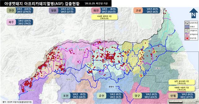 [ASF본부] 야생멧돼지 ASF 8건 발생(11월 19일~25일), 소양호 이남 발견, 누적 812건 |