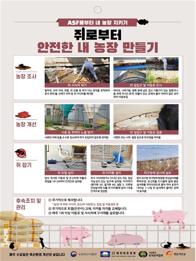장마철 이후 아프리카돼지열병(ASF) 예방을 위한 농장 단위 차단방역 철저 - 농장 쥐·해충 제거, 돈사 출입시 방역수칙 준수 - □ 아프리카돼지열병(ASF) 중앙사고수습본부(본부장: 김현수 농식품부 장관)는 아프리카돼지열병이 사육돼지로 전파되는 것을 차단하기 위해 장마철 이후 ①농장 쥐·해충 제거와 ②돈사 출입시 손 소독, 장화 갈아신기 등 방역수칙 준수에 만전을 기한다. ㅇ 장마철 이후 무더위가 찾아오면 곤충 등 매개체 활동이 활발해짐에 따라 아프리카돼지열병(이하, ‘ASF’) 확산 가능성이 증가할 우려가 있고, * 유럽식품안전청(EFSA)의 2018.11.~2019.10. ASF 발생 사례 분석 결과, 우기 후 곤충 등 매개체 활동이 활발해져 ASF 확산 가능성이 증가하였다고 추정 ㅇ 돈사를 자주 출입하고 사육돼지와 직접 접촉하는 농장 근로자에 의해 아프리카돼지열병 바이러스가 전파되지 않도록 하는 것이 가장 중요하다는 판단이다. ㅇ 기상청에 따르면, 올여름 장마는 6월 24일부터 본격적으로 시작하였고, 남부지방은 7월말부터, 중부지방은 8월 상순 이후부터 점차 영향권에서 벗어날 것으로 예상된다. □ 중수본은 장마철 많은 비로 인해 접경지역의 오염원이 하천을 타고 떠내려와 농장 내로 ASF 바이러스가 유입되지 않도록, ㅇ 집중호우 대비 ‘ASF 위험주의보’를 발령하여(2020.6.24.~) 접경지역 양돈농가에 ①하천·농경지 방문 금지, ②돼지 음용수는 상수도로 대체하거나 지하수를 소독하여 사용 등 방역수칙을 전파하고, ㅇ 비가 그친 뒤에는 하천 주변, 도로, 농장 등을 일제히 소독하고, 농장 주변 생석회 벨트를 다시 구축하는 등 방역 조치를 강화하였다. [ 농장 쥐·해충 제거 ] □ 장마철 이후 중수본은 전국 양돈농가에서 쥐·해충 제거 활동을 적극적으로 이행하도록 홍보·캠페인과 점검을 지속 추진한다. ㅇ 전국 양돈농가(6,066호)에 홍보 리플릿(7천부) 등을 배포하는 등 구체적인 쥐·해충 제거 요령을 안내하고, - 외국인 근로자도 어려움 없이 요령을 숙지할 수 있도록 15개국 언어로 번역된 문자메시지를 개인별 국적에 맞춰 발송(주 1회)하고 있다. ㅇ 매주 수요일「축산 환경·소독의 날」에 농가 스스로 쥐·해충 제거 활동을 일제히 실시하도록 캠페인도 운영하고 있다. ㅇ 중수본은 지난 4월 한돈협회와 협업하여 전문업체 용역으로 경기·강원 북부지역 양돈농장에 쥐·해충 방제를 지원하였고, 이후 매주 화요일 지자체와 농협이 보유한 소독차량을 활용하여 전국 양돈농장의 쥐·해충 방제를 지원*하고 있다. * (7.14일) 소독차량 354대로 2,863호 방제 지원, (7.21일) 276대로 2,798호 지원 ㅇ 또한, 경기도와 강원도 ASF 현장상황실*에서 접경지역 양돈농장**을 방문하여 쥐·해충 제거 실태를 점검·지도하고 있다. * 야생멧돼지 ASF가 지속 발생중인 접경지역 현장 방역관리 강화를 위해 농식품부·환경부·행안부·국방부·지자체 합동으로 경기도와 강원도에 ASF 현장상황실을 설치·운영중(강원: ’20.2월~, 경기: ’20.3월~) ** 포천, 철원, 화천, 고성, 인제, 양구 등 6개 시·군 239호 [ 돈사 출입시 방역수칙 준수 ] □ 중수본은 ASF가 직접 접촉에 의해 전파되는 만큼, 농장 종사자들이 돈사 출입 시「손 세척·소독」,「장화 갈아신기」등 방역수칙을 철저히 준수하는 것이 예방의 핵심이라는 점을 지속 강조하고 있다. ㅇ 전국 양돈농장(6,066호) 일제점검(2020.4.~현재) 결과, 돈사 입구에 전용 장화를 비치하지 않거나 손 세척·소독 설비를 갖추지 않는 등 미흡한 농가*들이 지속 확인되고 있는 상황으로, * 1차 점검 결과(2020.4.1.~5.31) : 238호 미흡 / 193호(81%) 보완 완료2차 점검 중간 결과(2020.6.1.~) : 18호 미흡 / 6호(33%) 보완 완료 - 점검인력들이 농가에 돈사 출입시 방역수칙 준수의 중요성을 설명하고, 이에 필요한 설비를 조속히 갖추도록 조치하고 있다. ㅇ 특히, 인공 수정 · 사양 관리 등을 위해 사람과 직접 접촉이 잦은 모돈에서 ASF가 발생할 위험이 높은 만큼, * 국내 사육돼지 ASF 발생농장 14개소 중 11개소가 모돈에서 발생(’19.9~’19.10) ㅇ 7월 17일부터 ‘모돈 ASF 위험주의보’를 발령하여, 문자메시지와 재난방송자막 등을 활용하여 농가에 “모돈 접촉을 자제하고 부득이한 경우 위생장갑을 반드시 착용” 하는 등 모돈사 출입시 지켜야할 방역수칙을 전파하고 있다.