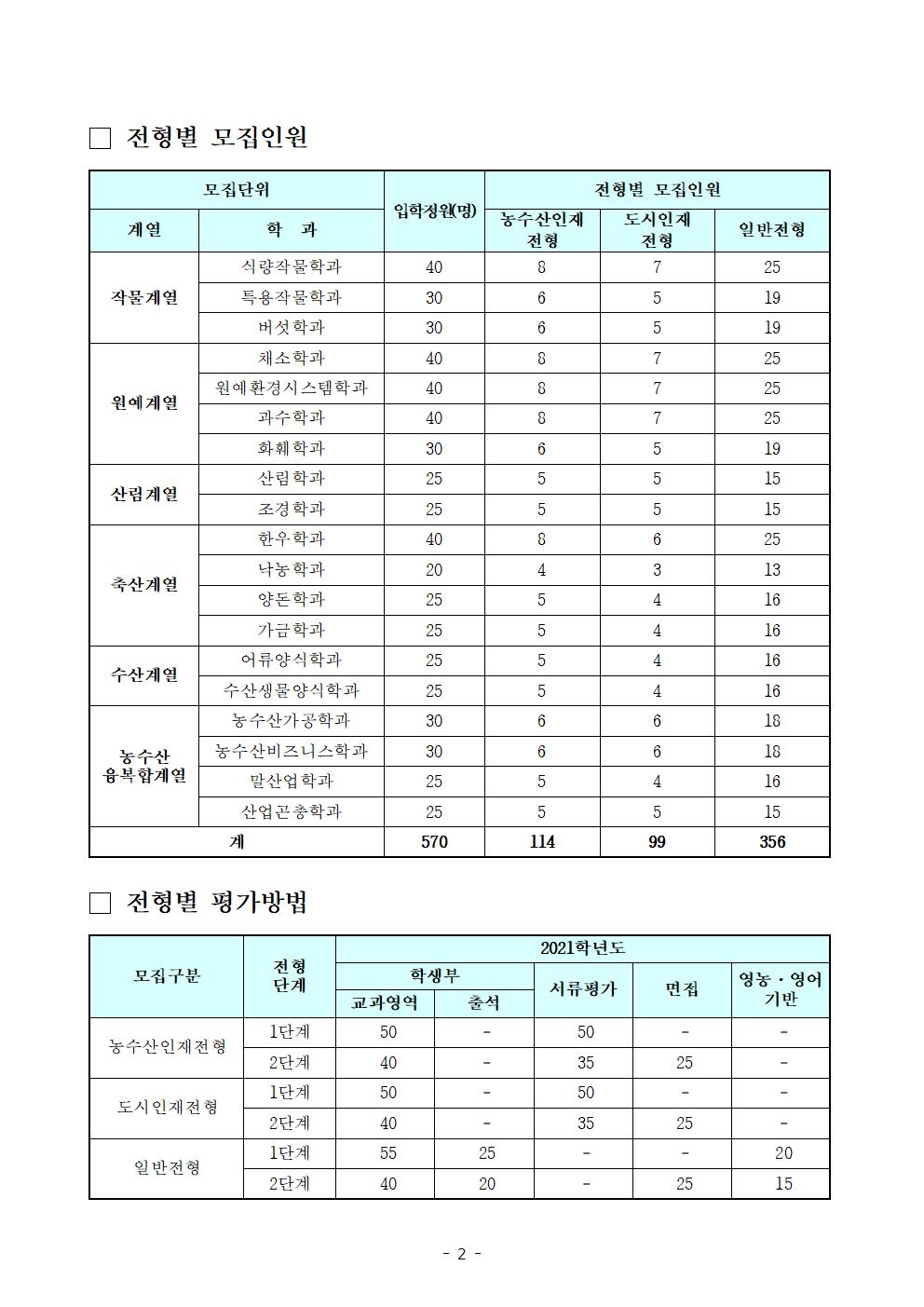 한국농수대학, 2021학년도 신입생 수시모집 진행 - 농수산인재, 도시인재, 일반전형으로 570명 선발 - << 주 요 내 용 >> ◈ 한농대는 9월과 10월 '21학년도 신입생 선발을 위한 전형별 원서접수 진행 ㅇ (모집일자) 농수산‧도시인재전형 : 9.23(수) 9시 ~ 10.12(월) 18시, 일반전형 : 10.19(월) 9시 ~ 10.30(금) 18시 ㅇ (모집인원) 570명(농수산인재전형 114, 도시인재전형 99, 일반전형 357) ◈ 모집정원 확대 : (‘20) 18개 학과 550명 → (‘21) 19개 학과 570명 * 수산양식학과(정원30명)가 어류양식학과(25)와 수산생물양식학과(25)로 분과 ◈ 청년 창업농 육성을 위한 도시인재전형 모집정원 확대(83명→99) << 세 부 내 용 >> □ 국립한국농수산대학(이하 한농대)은 2021학년도 신입생 선발을 위해 9월과 10월 수시모집 전형별 원서접수를 진행한다. ○ 한농대는 매년 수시모집으로만 신입생을 선발하고 있으며, 수시모집에는 농수산인재, 도시인재, 일반전형이 있다. <참고 1> ○ 모집정원은 전년(550명)보다 20명이 늘어난 570명*이며, 청년 창업농 육성을 위해 도시인재전형 모집정원을 99명**으로 확대하였다. * 수산양식학과(30명)를 어류양식학과(25명)와 수산생물양식학과(25명)로 분과하여 신입생을 모집 ** 도시인재전형의 모집정원 확대 : (’20) 83명(정원대비 15%) → (’21) 99명(17%)