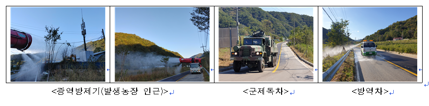 아프리카돼지열병(ASF) 방역 추진상황 - 발생지역 집중소독, 예찰·정밀검사 및 역학조사, 현장점검 등 실시 - □ 아프리카돼지열병 중앙사고수습본부(본부장 김현수, 이하 ‘중수본’)는 10월 9일, 강원도 화천 소재 양돈농가의 사육돼지에서 아프리카돼지열병이 확진된 이후 신속하고 철저한 초동방역을 실시중에 있다. □ 중수본은 943대의 소독장비(광역방제기·소독차·軍제독차 등)를 동원해 전국의 양돈농가 6,066호에 대한 일제소독을 실시하였다. ㅇ 특히 금번 발생농장이 위치한 강원도 화천군에 대해서는 11대의 소독장비(광역방제기 2대, 소독차 4, 軍제독차 5)를 긴급 투입*하여 발생농장과 주변 연결도로 등을 집중소독하고, * 발생 전부터 소독을 위해 운영중이던 6대(지자체 소독차 1, 농협 2, 검역본부 1, 농협 광역방제기 1, 軍제독차 1)에 5대(농협 광역방제기 1, 軍제독차 4)를 추가 투입 ㅇ 최근 1개월간 화천군 내 통행량을 분석하여 축산차량 통행이 많은 4개 도로(약 20km)에 대한 소독도 실시하였다.
