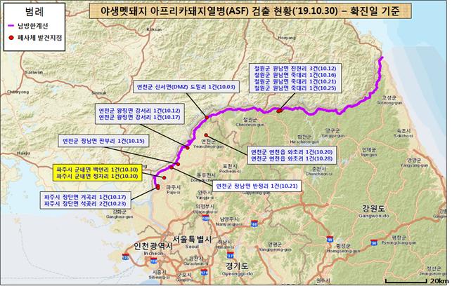 1030일 오후 1시경 국립환경과학원은 신고된 3개의 폐사체 중 2개에서 아프리카돼지열병 바이러스를 확진하고 결과를 관계기관에 통보하였다. 이로써 파주지역에서 5건의 아프리카돼지열병이 확진되었으며, 전국적으로는 18건으로 늘어났다.
