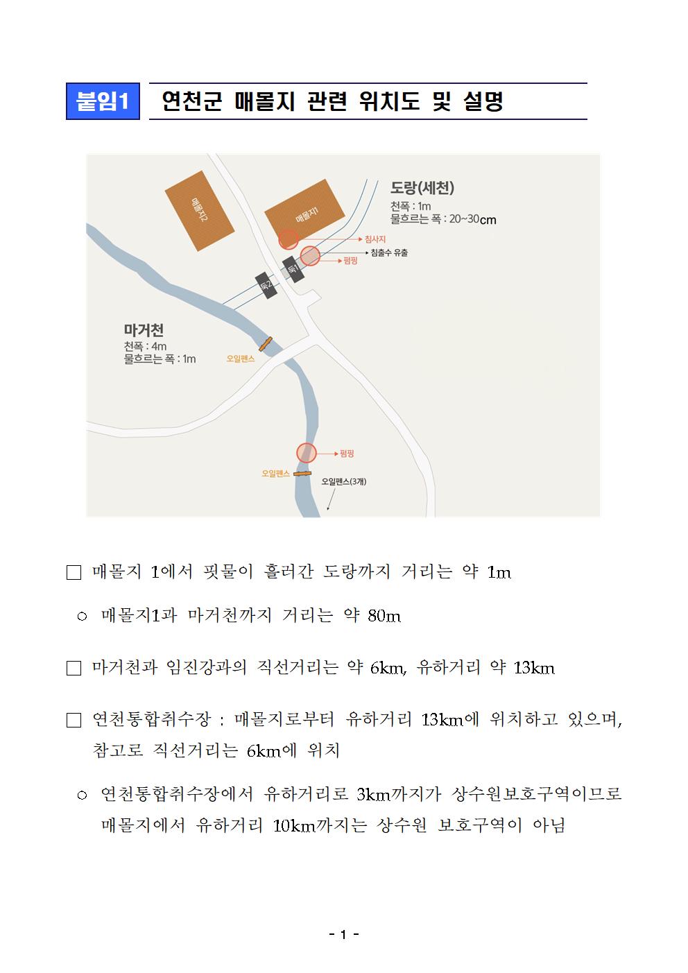 연천군 매몰지 침출수 관련 조치 상황 □ 중앙사고수습본부는 11월 11일 농림축산식품부(이하 농식품부) 관계관을 연천 현장으로 파견하여 매몰지 인근 수질에 문제가 없도록 매몰 처리과정에 대한 지도․감독을 강화하였음 ㅇ 농식품부 파견관이 매몰지 인근 작은 하천인 마거천과 임진강이 만나는 지점까지 약 13km를 확인한 결과, 침출수는 없는 것*으로 확인되었음 * 11.10일과 11일에 매몰지 주변 도랑과 인근 작은 하천에 침출수가 있었으나 제거되었고 차단 조치로 그 이후 추가 침출수가 도랑과 하천에서 확인되지 않음 ㅇ 연천군은 지난 11월 10일~11일 긴급 차단 조치로서 침출수 유입부에 침사지(沈砂池)와 2개의 둑을 설치하였음 □ 환경부와 연천군은 매몰지 인근 마거천과 임진강의 4개 지점에서 시료를 채취하여 11월 12일 수질검사를 의뢰하였으며, ㅇ 환경부는 지속적으로 연천군 매몰지 인근 하천에 대해 수질 검사 등을 통해 수질을 관리해 나갈 계획임 ㅇ 연천군 및 인근 취수장 2곳(연천통합취수장, 금파취수장*)은 매몰지와 각각 하천 길을 따라 약 13km와 약 55km로 먼 거리에 위치해 있음 * 파주시는 언론보도 이후 시민 불안을 우려하여 금파취수장에서 지난 12일 12시경 취수를 일시 중단하였으나 특이사항이 없어 오후 3시에 취수 재개 □ 아프리카돼지열병 관련 매몰지 전체(101개소)에 대해 관할 지자체가 일제 점검 중이며, 침출수 유출 우려 등 환경적 우려가 발견되면 즉시 시정할 것임 ㅇ 이와는 별도로 농식품부․환경부․지자체 합동 점검반(10개반 30명)을 구성하여 전체 매몰지에 대해 11월 29일까지 점검을 완료할 계획임