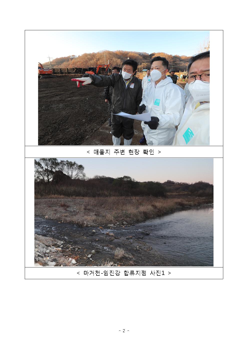 경기 연천군 매몰지 침출수 관련 현장점검 결과 하천수 수질 문제 없고, 매몰도 완료 □ 중앙사고수습본부장(김현수 농림축산식품부 장관, 이하 “중수본부장”)은 경기도 연천군 살처분 매몰 현장의 침출수 유출과 관련하여 관계부처, 지자체의 조치사항을 직접 확인하기 위해 현장점검을 실시하였다. □ 경기도 연천은 지난 10월 9일 아프리카돼지열병이 추가로 발생함에 따라 확산 방지를 위해 지역 내 모든 돼지를 살처분 하는 특단의 조치를 실시하였다. ㅇ 파주‧연천‧철원에서 야생멧돼지 아프리카돼지열병이 지속 발생하여 신속한 처리가 필요하였고, 많은 물량을 처리하는 과정에서 대기 중인 차량과 야적된 사체의 침출수가 유출되었다. □ 11월 10일 연천군은 침출수 유출을 확인한 즉시 도랑과 마거천에 유출된 침출수를 준설차와 소형 모터를 활용하여 제거하였다. ㅇ 침출수가 도랑으로 흘러가지 않도록 저류조를 만들었고, 도랑에 이중의 둑을 설치하여 추가 오염을 차단하였다. ㅇ 농식품부는 관계관 4명을 현장에 파견하여 수질 관리와 매몰지 작업 상황을 지도‧감독하였다. □ 중수본부장은 마거천이 임진강에 합류하기 전 300m 지점, 침출수가 확인되었던 마거천, 침출수가 유출된 매몰지 인근 마거천 최상류 지점과 매몰지를 점검하였다. □ 첫 점검 지점은 마거천이 임진강에 합류하기 전 300m 지점이었으며, 매몰지에서 하천길을 따라 약 13km 떨어진 곳으로 상수원 보호구역 시작점이다. ㅇ 환경부 한강유역환경청장은 수질검사 결과 이상이 없다고 보고하였으며, 현장에서 환경부 직원이 직접 수질을 측정하였으나 문제가 없었다. ㅇ 중수본부장은 수질 검사를 매일 실시하는 등 수질 관리에 만전을 기해 줄 것을 당부하였습니다. □ 두 번째 지점인 침출수가 확인되었던 마거천은 연천군에서 유출된 침출수를 확인한 즉시 준설차로 흡입하여 공공처리장에서 처리하였다고 보고하였다. ㅇ 중수본부장은 마거천에 흐르는 물의 상태를 꼼꼼하게 확인토록 하였습니다. □ 세 번째 점검은 침출수가 유출되어 고여있던 매몰지 인근 마거천 최상류 지역이었으며, 현재 이곳의 물은 매우 맑은 상태로 바닥에 작은 물고기도 보였다. ㅇ 중수본부장은 매몰지 침출수 유출 여부를 연천군에서 주기적으로 점검토록 하고, 비가 올 경우 하천이나 도로로 침출수가 흘러 나오지 않도록 사전 예방 조치를 철저히 해줄 것을 당부하였습니다. □ 마지막으로 조성이 완료된 매몰지와 그 주변지역입니다. 당초 사체가 야적되어 있었고, 사체를 적재한 차량이 현장에 있었던 지점이다. ㅇ 오늘 새벽, 매몰을 완료한 후 표면에 천막을 덮었지만, 앞으로 정리 작업이 필요한 부분을 확인하였다. ㅇ 매몰지 주변 지역은 침출수가 도랑으로 흘러가지 않도록 만든 저류조가 설치되어 있었고, 현재 저류조에 핏물은 들어오지 않고 있었다. ㅇ 중수본부장은 연천군에 매몰지가 야생동물에 의해 훼손되지 않도록 울타리를 조속히 설치해 줄 것을 당부하고, 악취발생과 비 피해를 방지하기 위해 비닐하우스와 배수로를 설치‧조성토록 하였다. ㅇ 매몰지 주변은 잔존물이 없도록 청소와 소독에 만전을 기하고, 진출입 차량의 소독을 철저히 하도록 하였다. ㅇ 주변에 하천이 있기 때문에 수질에 영향을 미치지 않도록 각별히 신경쓰고, 주기적으로 점검할 것을 당부하였다. □ 중수본부장은 “아프리카돼지열병의 추가 발생을 방지하기 위한 과정에서 연천군 매몰지 주변에서 침출수가 유출되었으며, 국민들께서 우려하는 일이 없도록 이번에 조성된 매몰지를 철저히 관리해 나갈 계획”이라고 밝혔다.