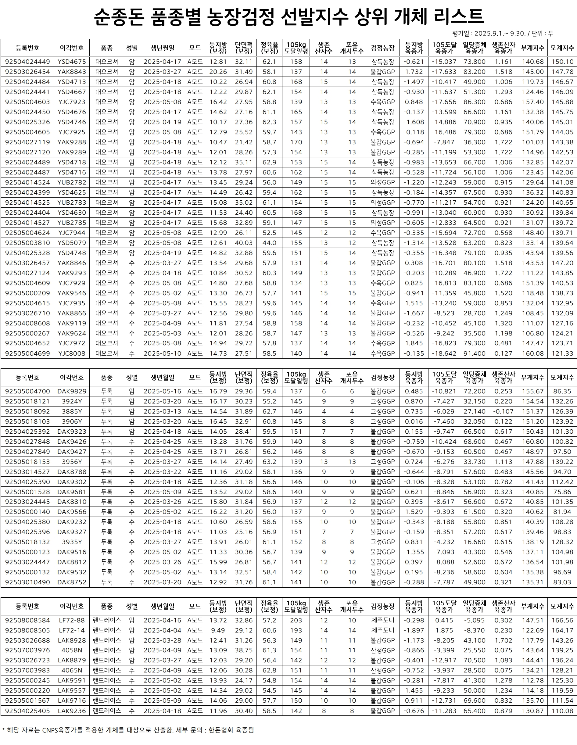 첨부파일 다운로드 25년 9월 순종돈 품종별 농장검정 선발지수 상위 개체 리스트.pdf
