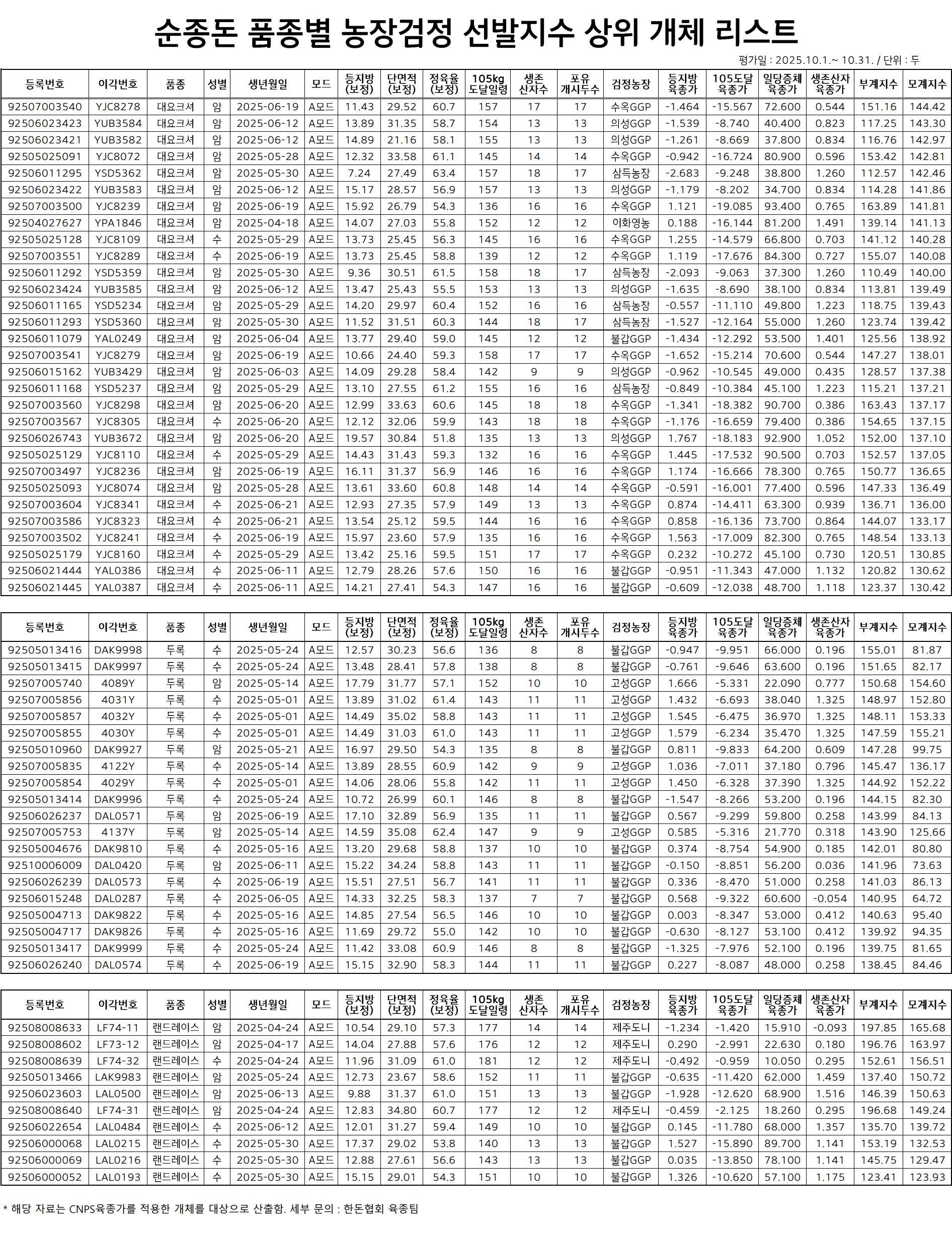 첨부파일 다운로드 25년 10월 순종돈 품종별 농장검정 선발지수 상위 개체 리스트.pdf