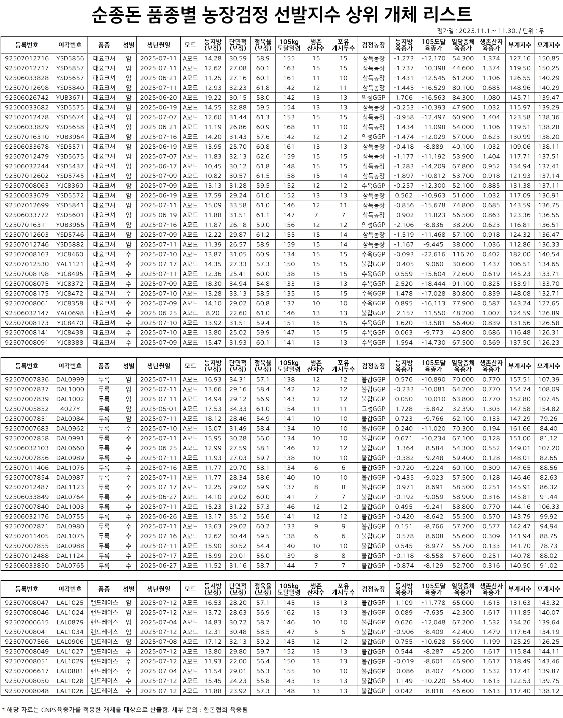 25년 11월 순종돈 품종별 농장검정 선발지수 상위 개체 리스트